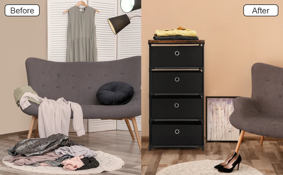 Are you tired of clutter? The Ljustra Black 4-Drawer Fabric Dresser is the perfect solution for creating a tidy and organized environment in your dorm, bedroom, or hallway. With its modern design and multifunctional use, this dresser not only provides ample storage but also enhances your home decor.