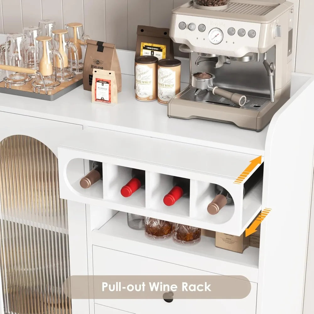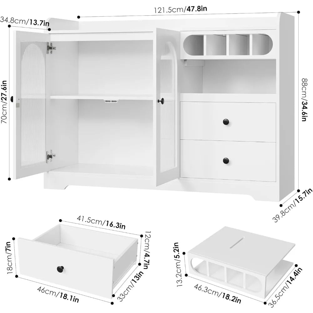 - Utility Storage Cabinet: Featuring 2 shelves with glass doors, 2 spacious drawers, and 4-slot wine racks, this cabinet offers ample space for kitchenware and barware.