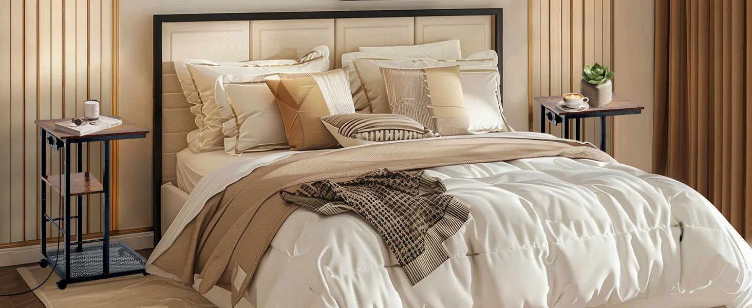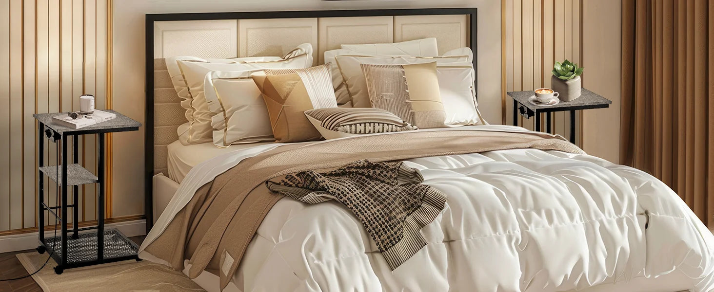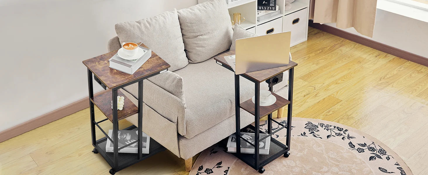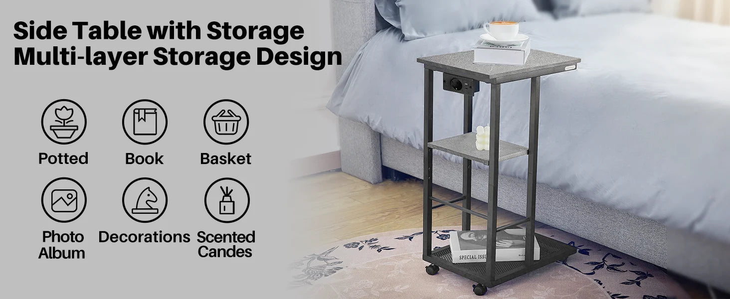 C Shaped End Table with Charging Station Rolling Wheels Small Space