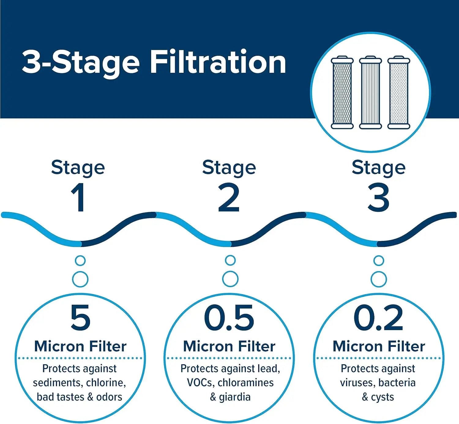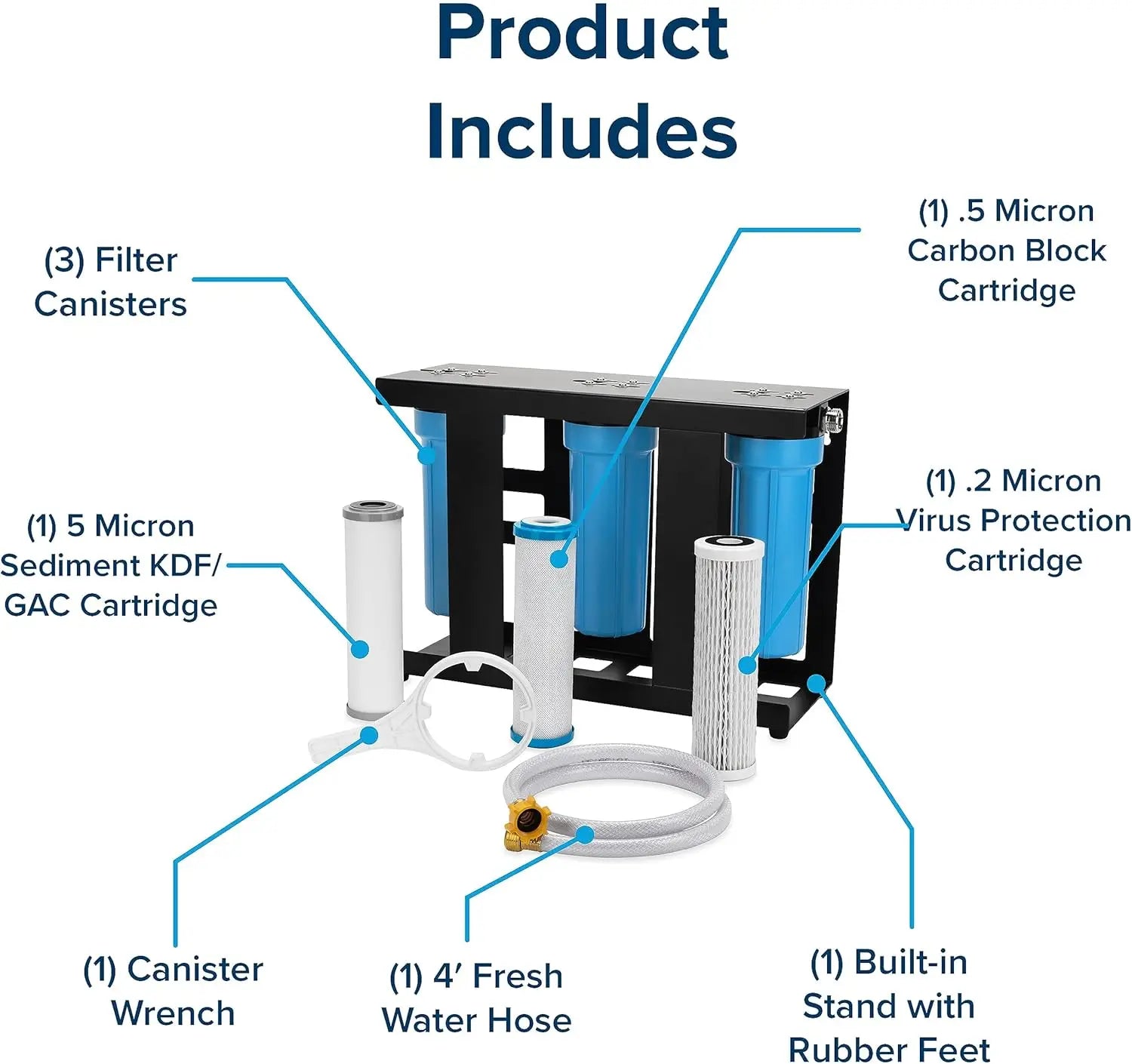 - Triple Stage Filtration System: Combines a 5-micron sediment filter, a 0.5-micron carbon block cartridge, and a 0.2-micron cartridge for thorough purification.