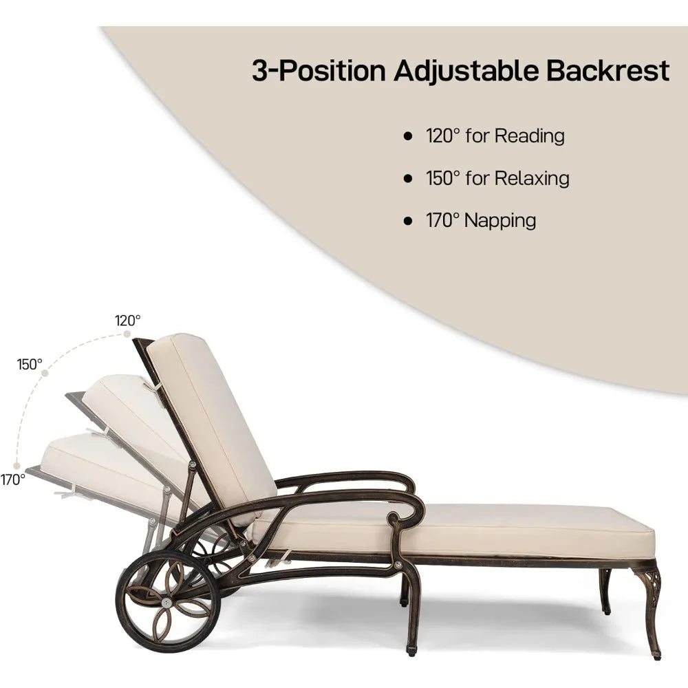 Cast Aluminum Outdoor Chaise Lounge Chair Adjustable Backrest Wheels