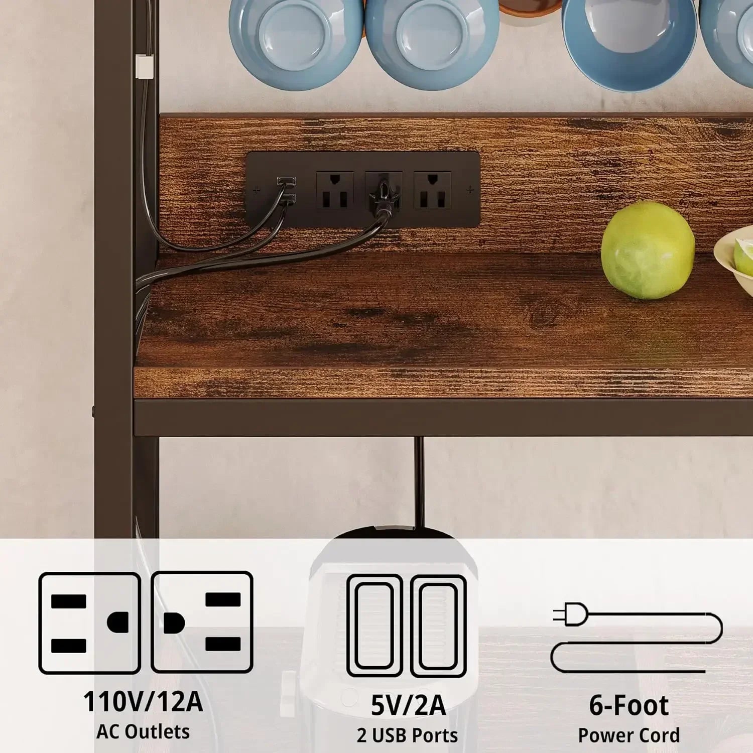 - Convenient Power Outlet: Equipped with 3 AC plugs and 2 USB ports, this cabinet allows you to charge your coffee maker and other devices effortlessly.