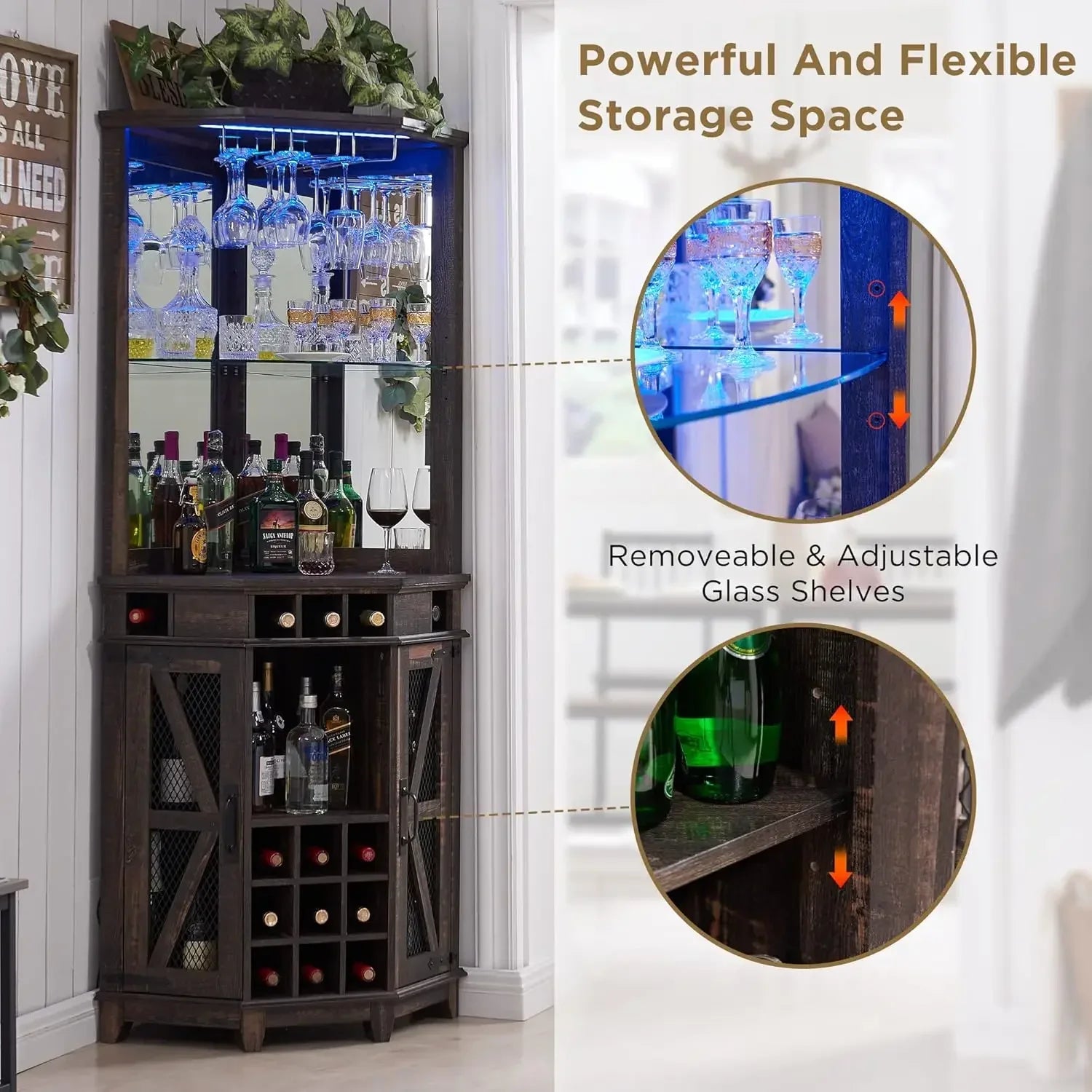 Ljustra Corner Bar Cabinet 72" Tall Farmhouse Wine Storage with LED Light