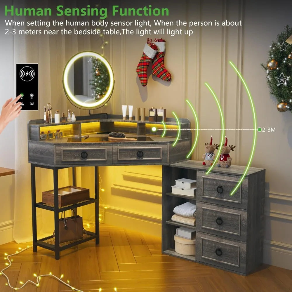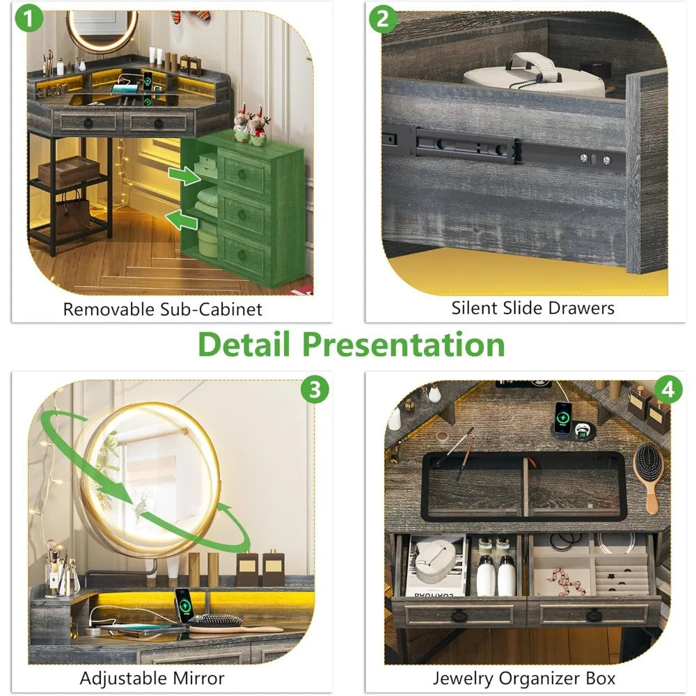 Corner Vanity Desk with LED Mirror and Makeup Organizer Charging Station