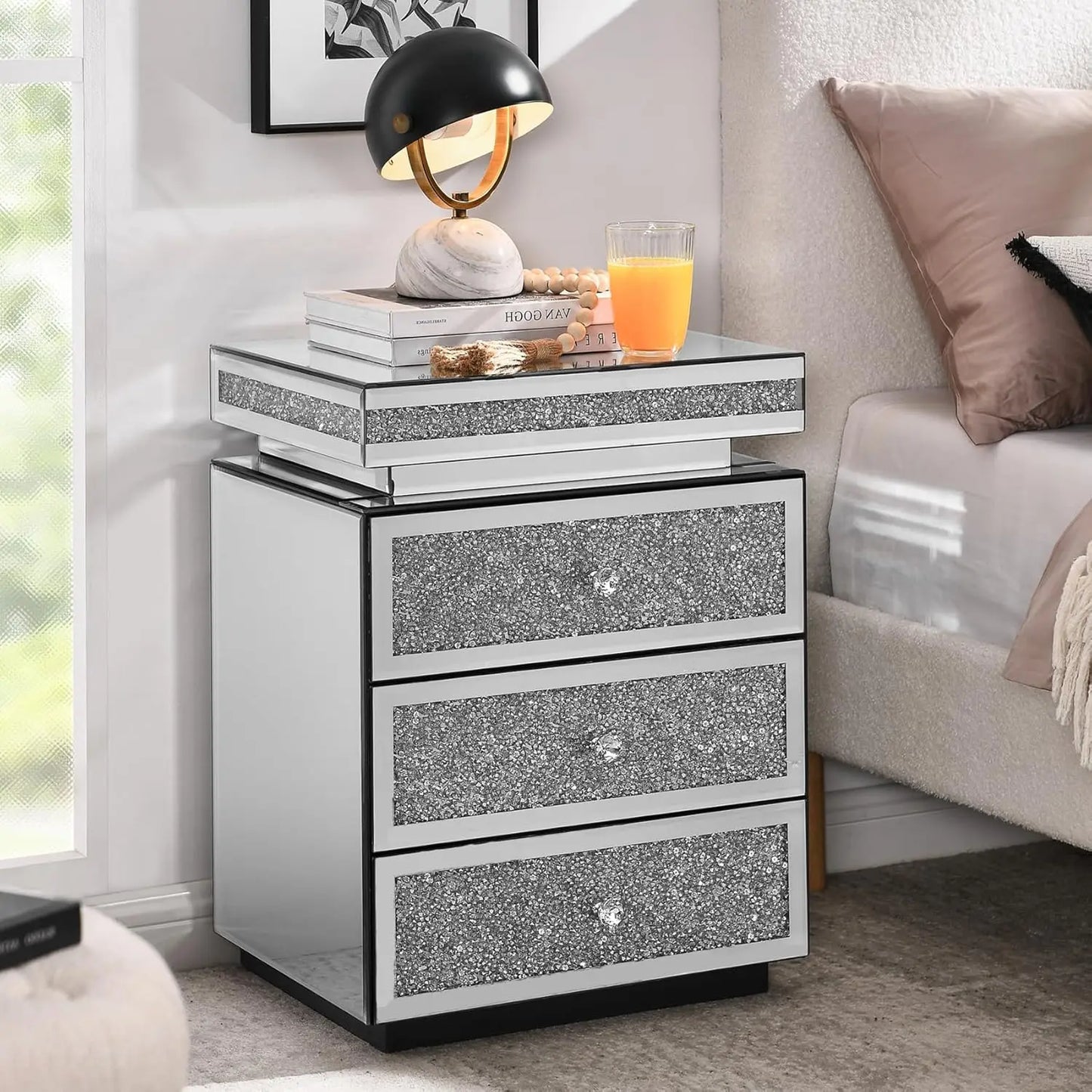Enhance your living space with the Ljustra Crystal Mirrored Nightstand, where style meets functionality.