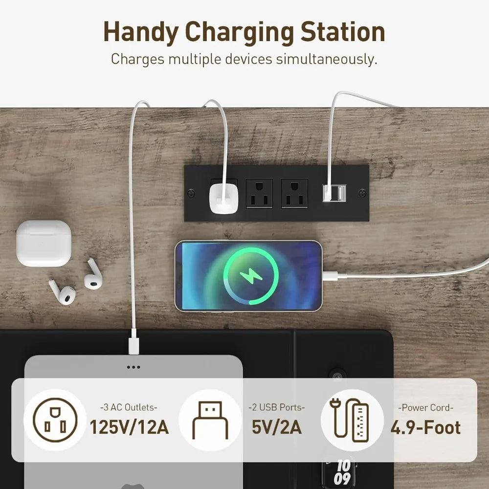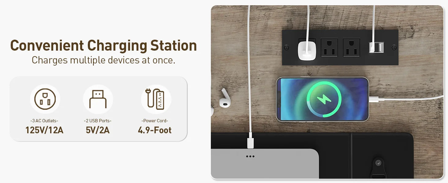 - Charging Station & LED Light: Equipped with 3 AC outlets and 2 USB ports, you can easily charge multiple devices. The LED strip offers customizable colors and music mode, creating the perfect ambiance for productivity.