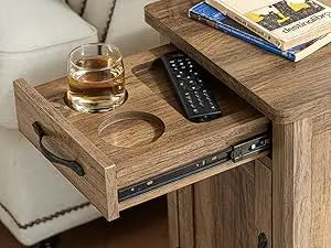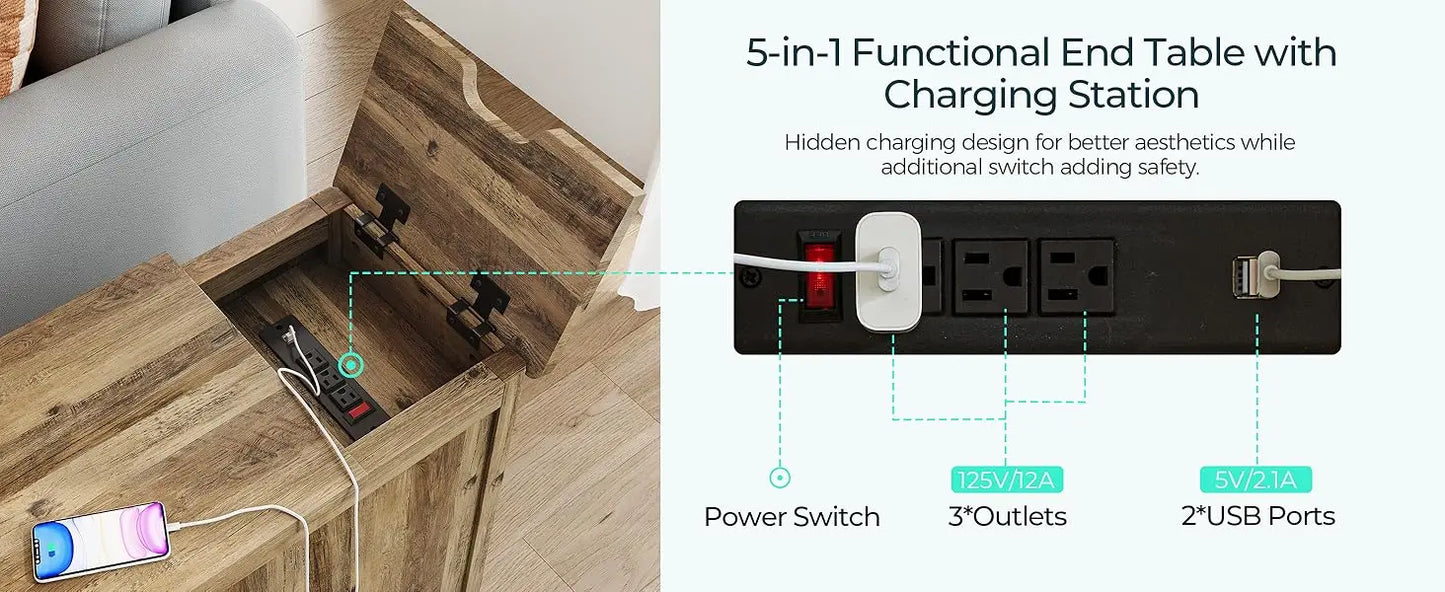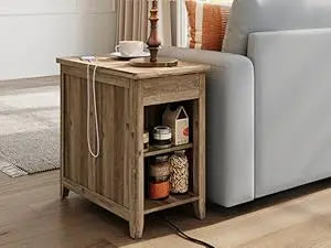 Ljustra Farmhouse End Table with Charging Station Narrow Side Table Storage