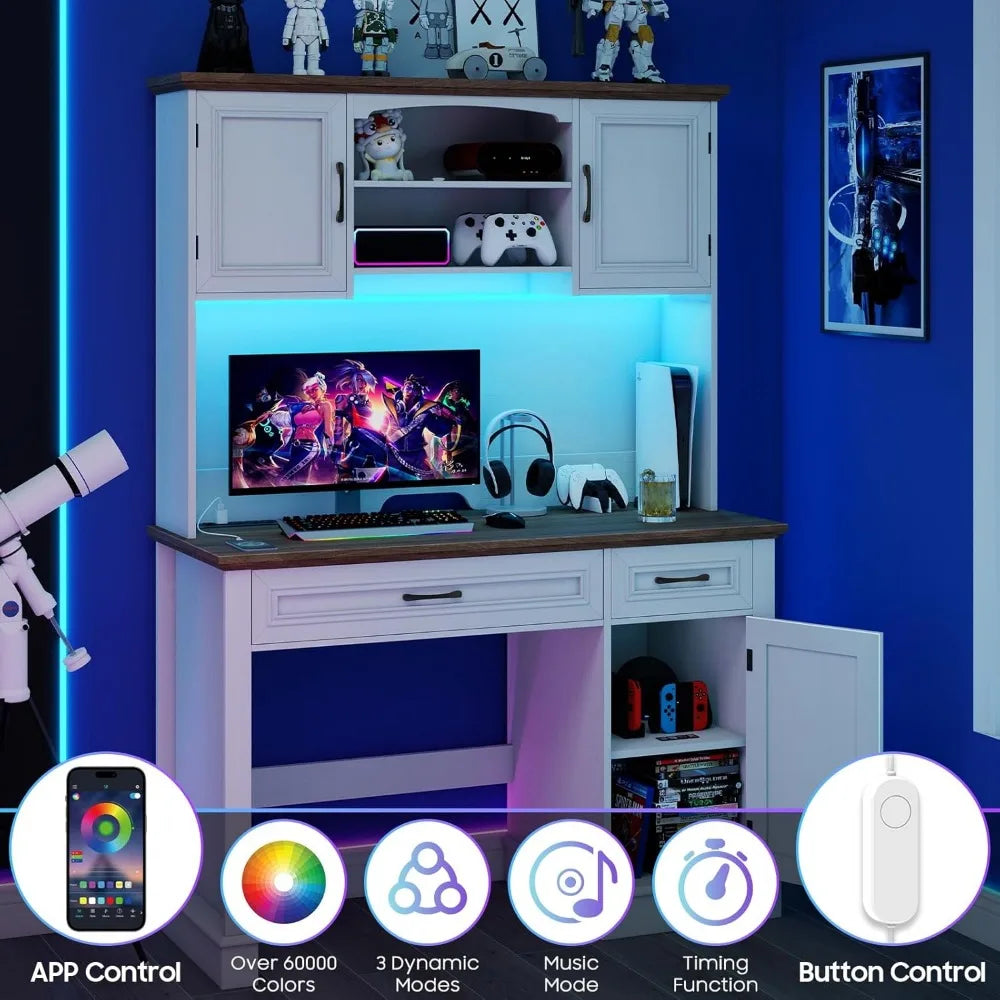 Farmhouse Executive Desk with Hutch LED Light Charging Station Storage