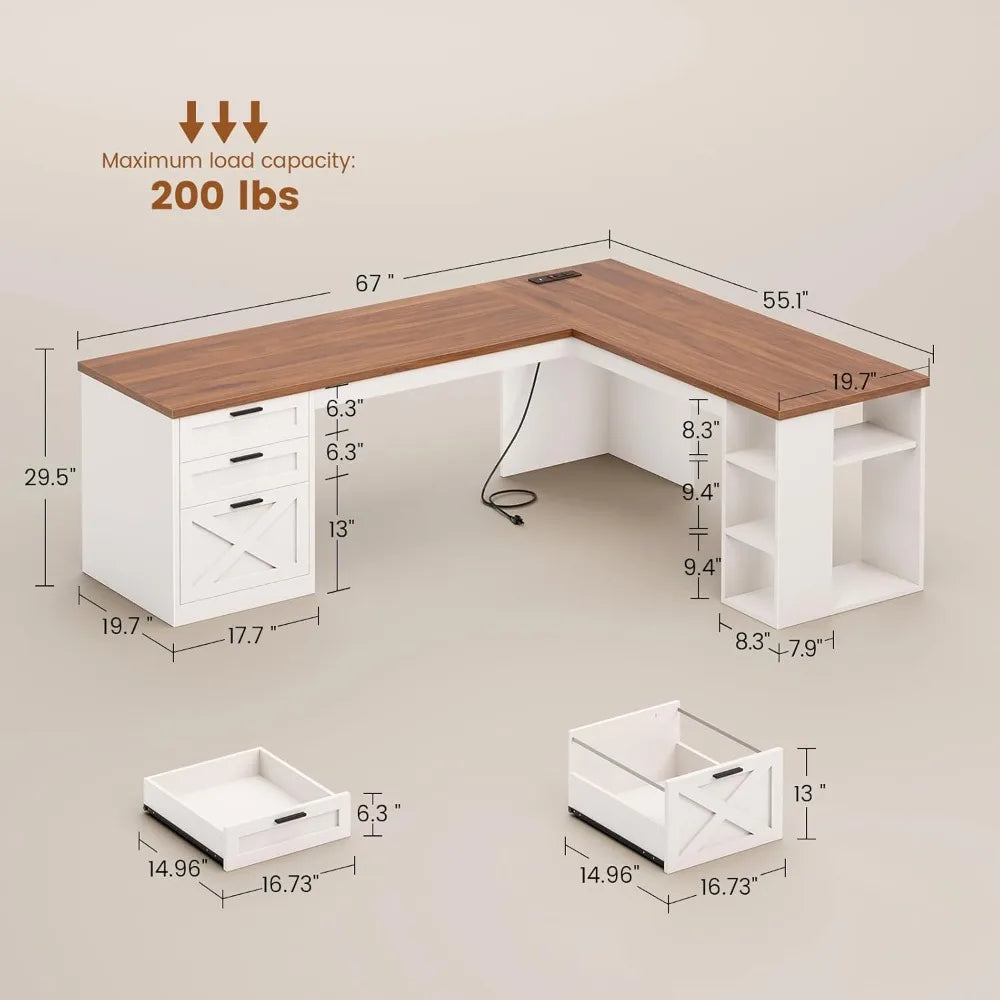 Farmhouse L Shaped Desk with 3 Drawers and Charging Station for Home Office