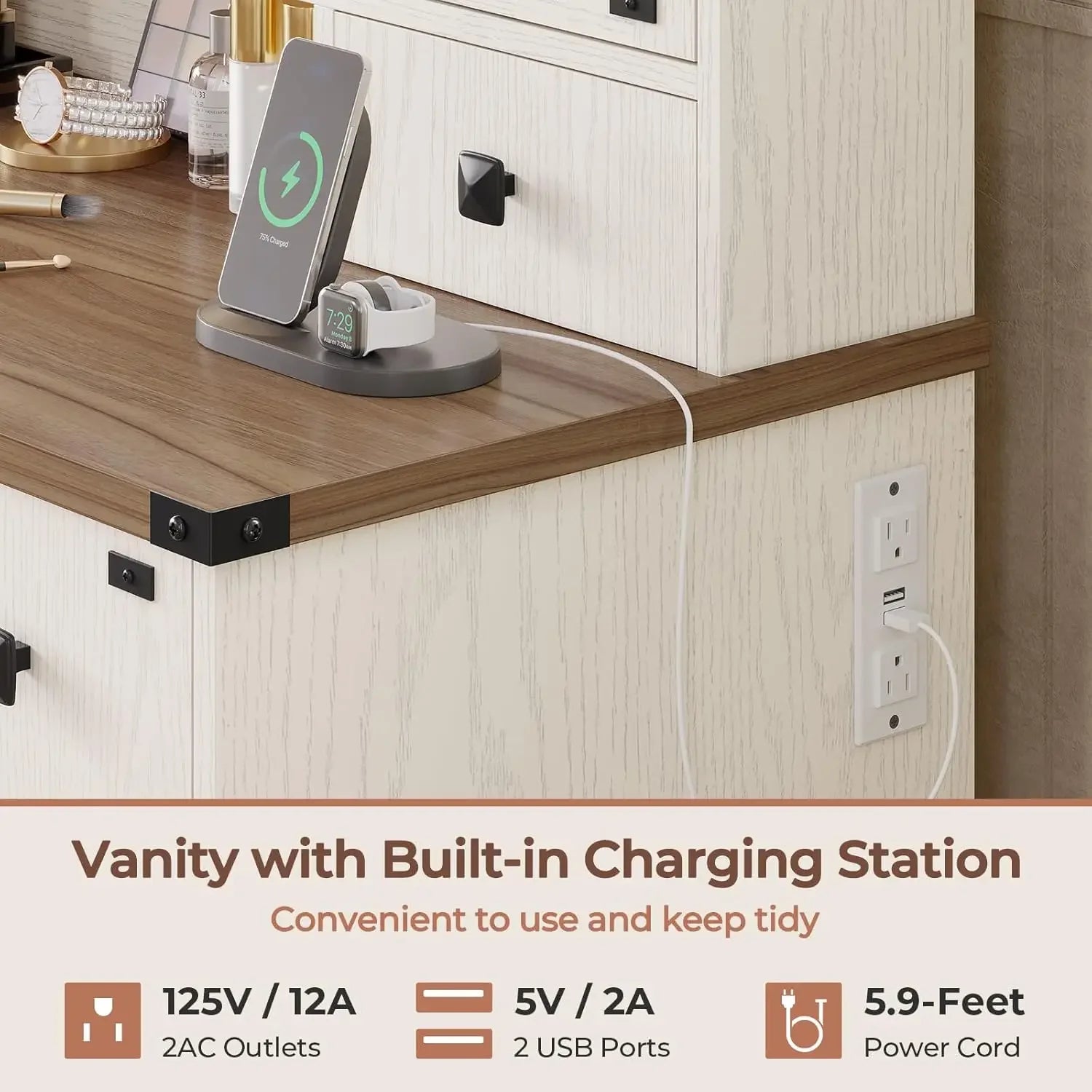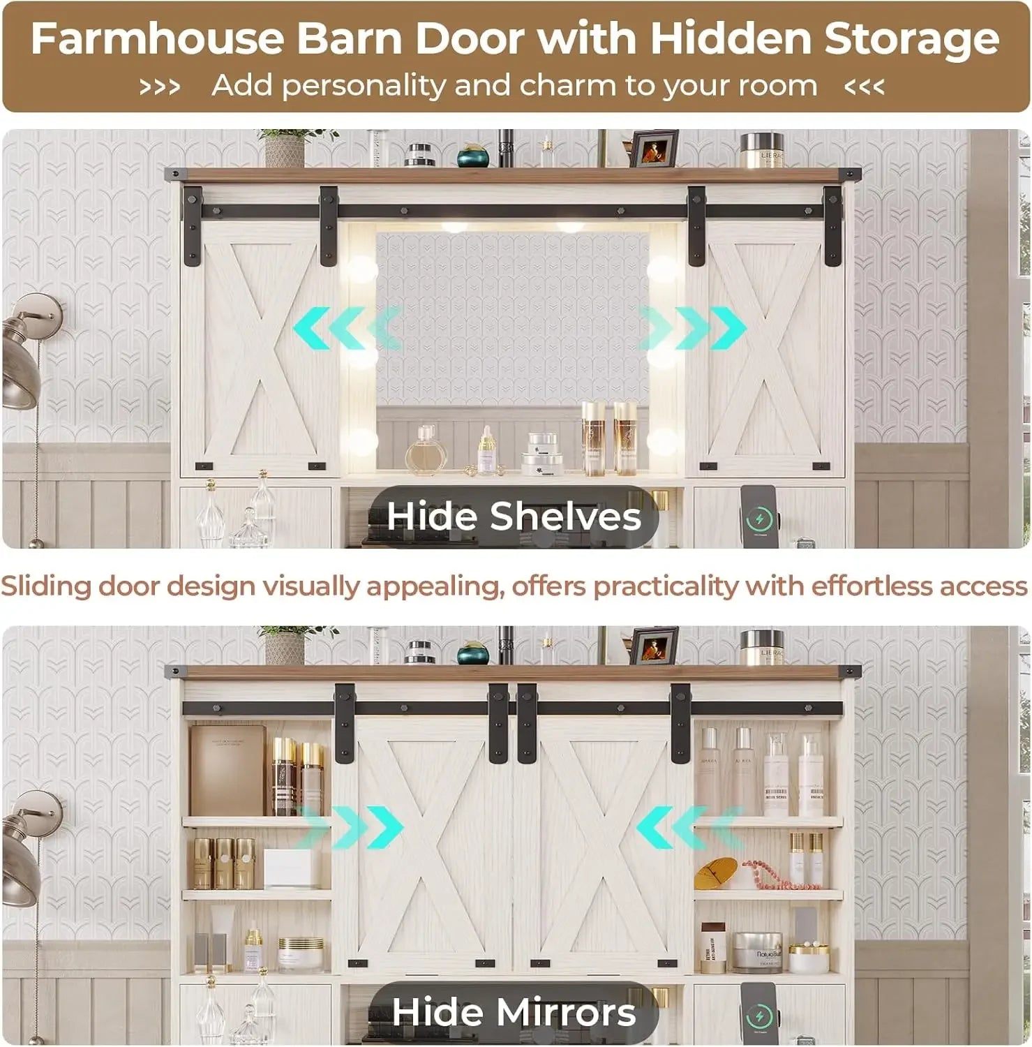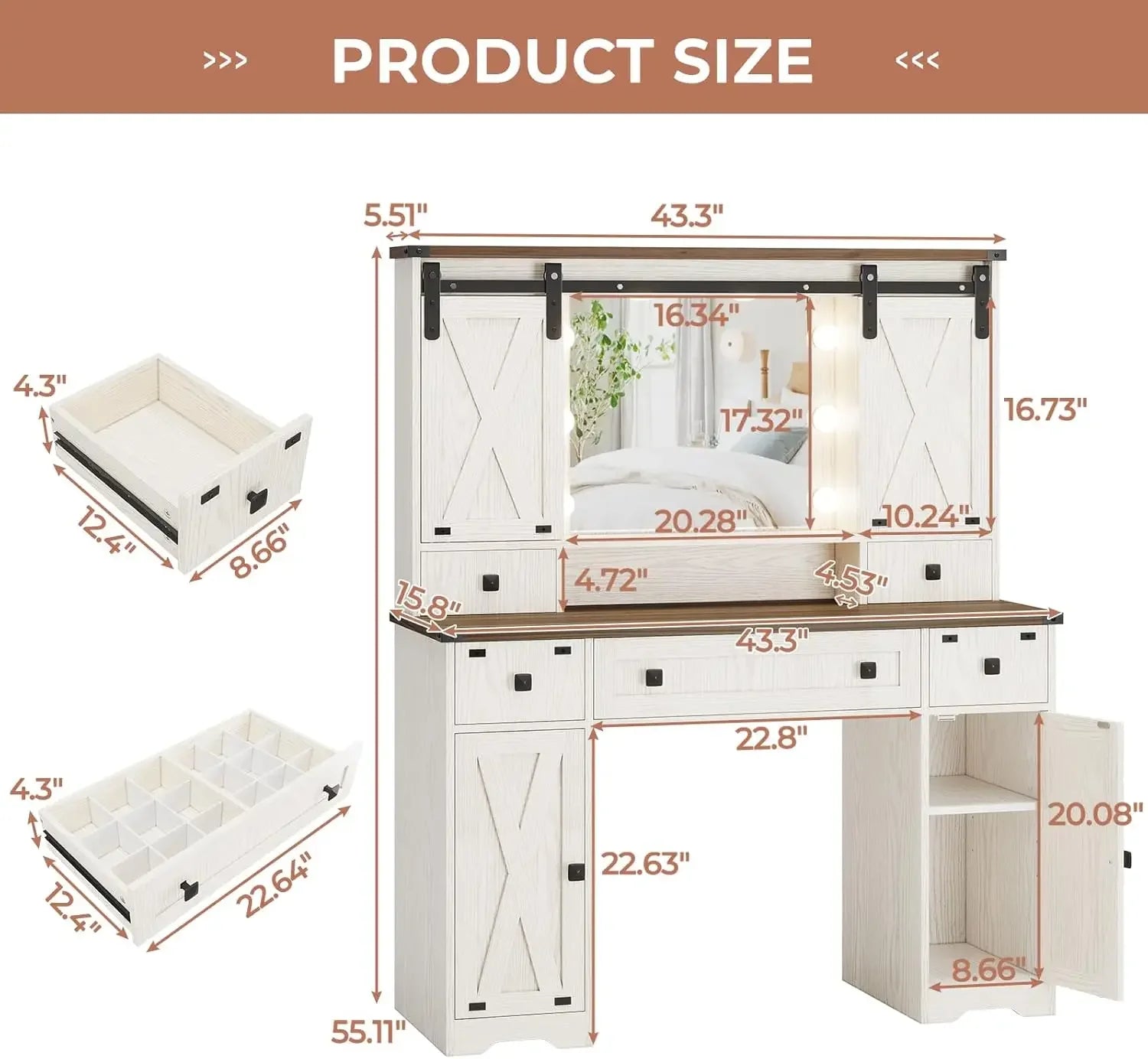 Farmhouse Makeup Vanity Desk with Lighted Mirror and Storage Drawers