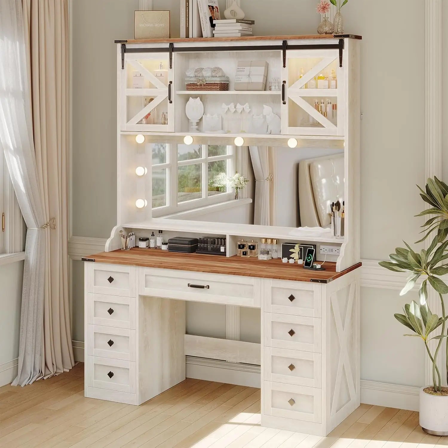 Farmhouse Makeup Vanity Desk with Mirror and RGB Lights 9 Drawer