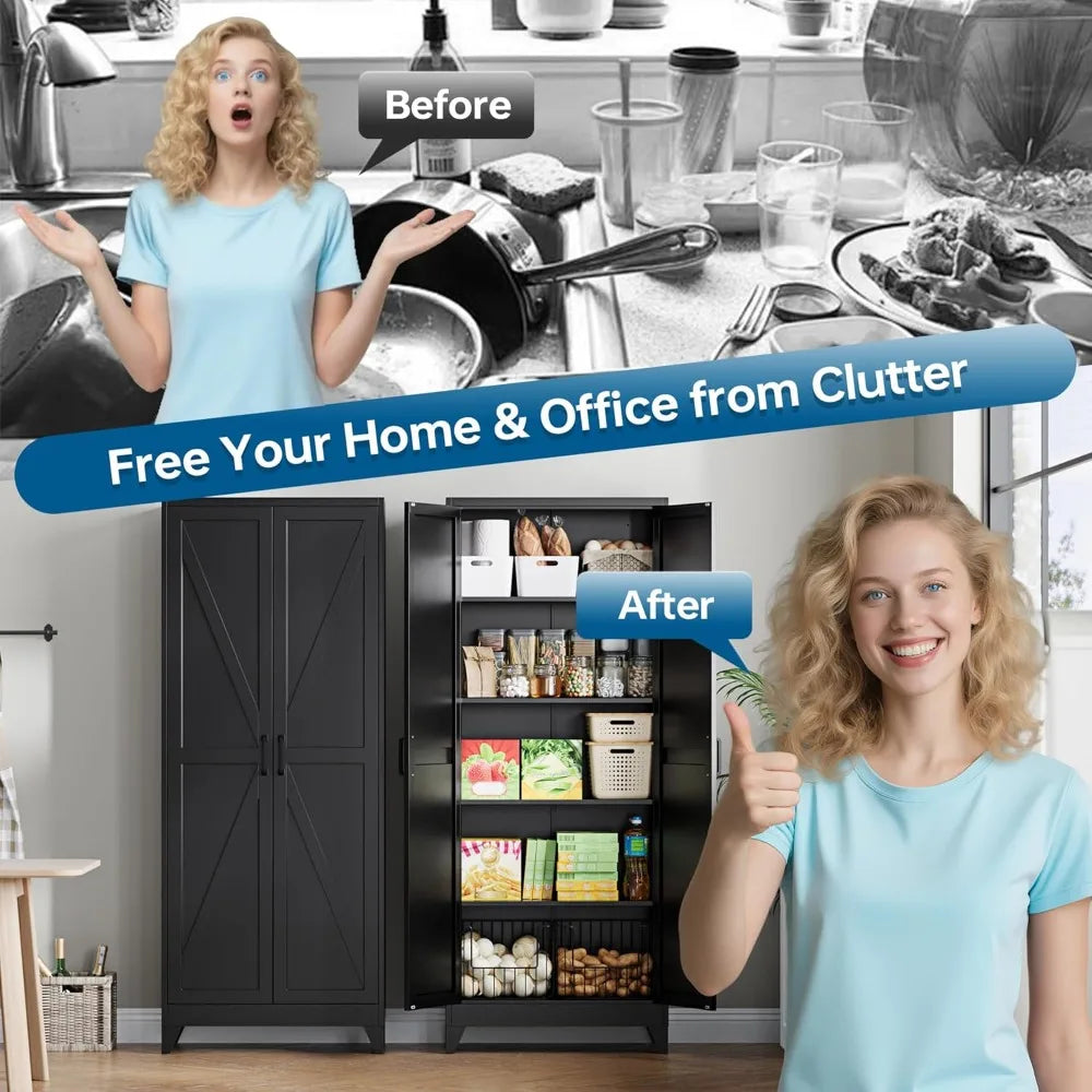 75 Inch Farmhouse Metal Storage Cabinet Adjustable Shelves Pantry Organizer