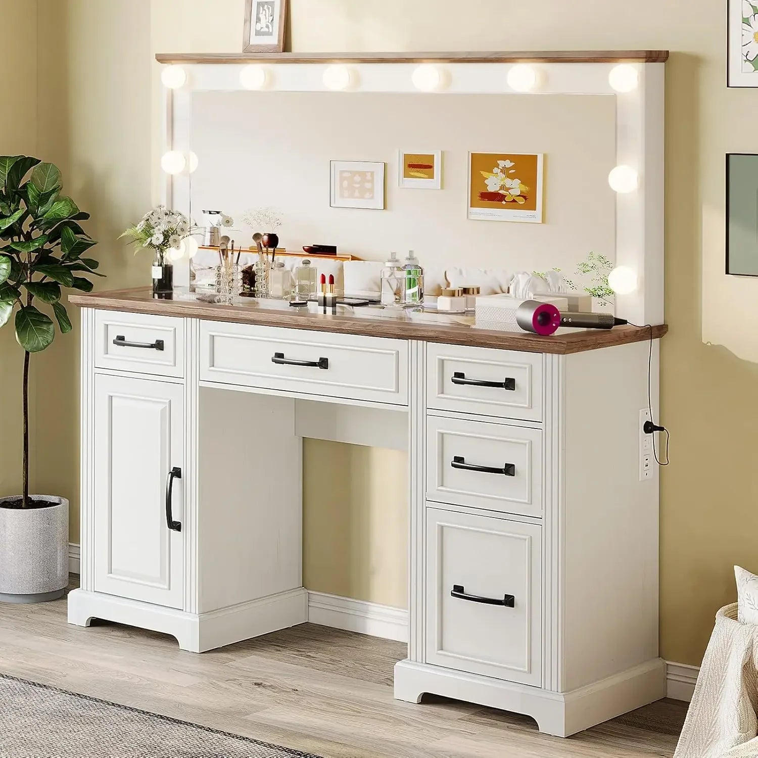 55 Inch Farmhouse Vanity Desk with Mirror Lights Charging Station 5 Drawers