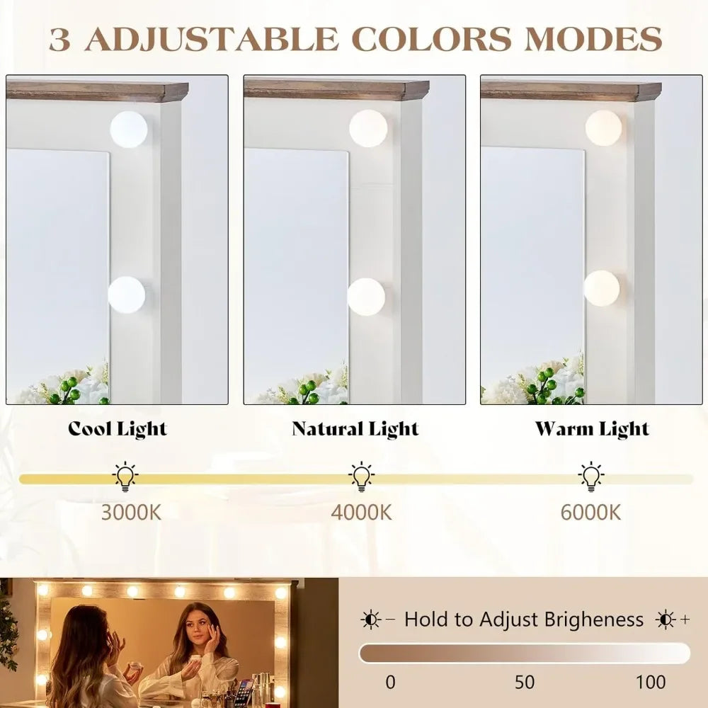 - Hollywood Makeup Lighting: Equipped with 10 bright Hollywood bulbs and a large mirror, switch between three different light colors—Cool, Natural, and Warm—to achieve your ideal makeup look.