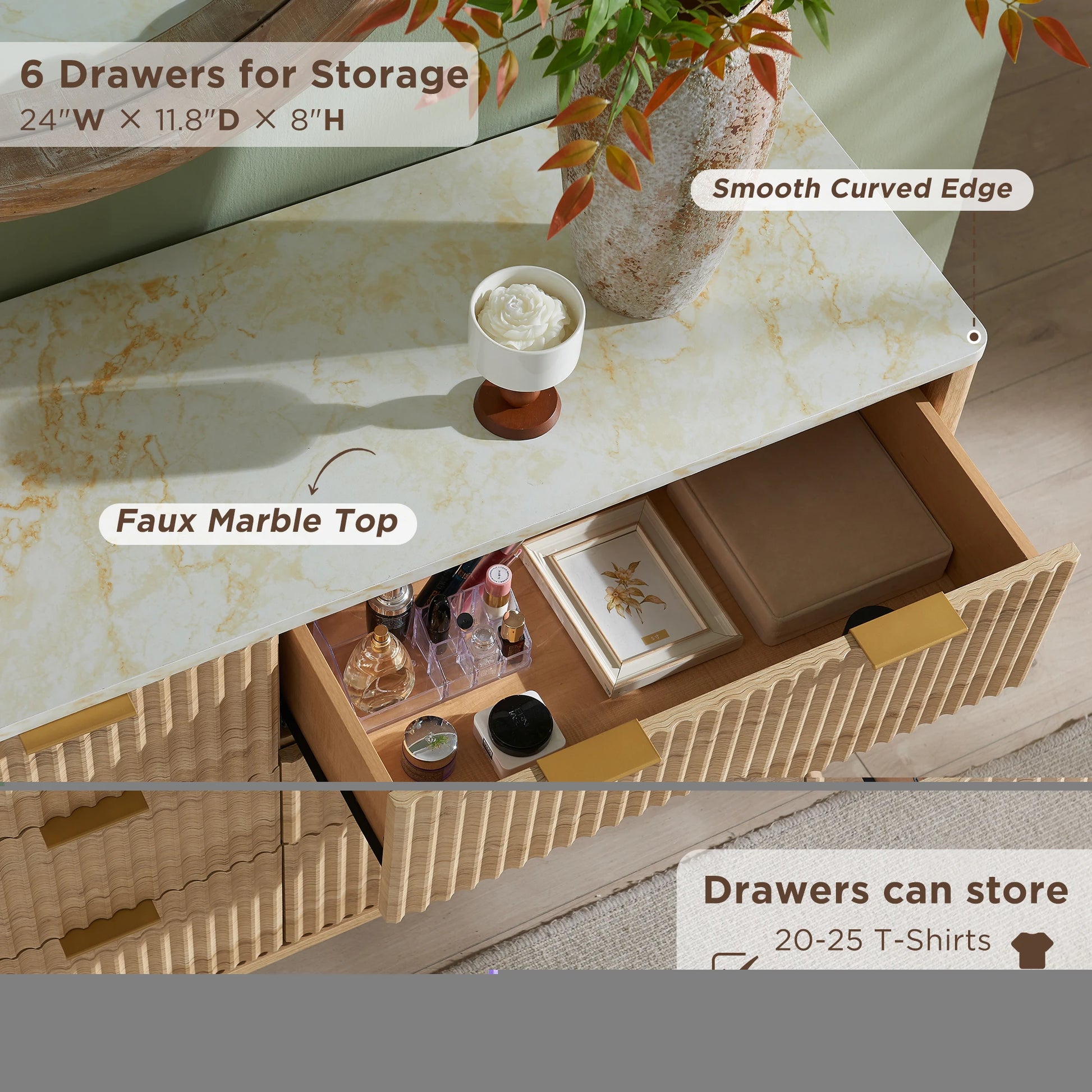 Modern 6 Drawer Dresser Faux Marble Top Fluted Chest of Drawers