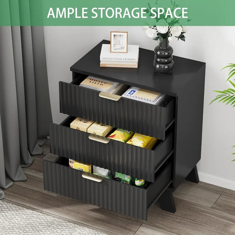 Fluted Nightstand 24 Inch Wide Side Table 3 Drawer Mid Century Modern Black