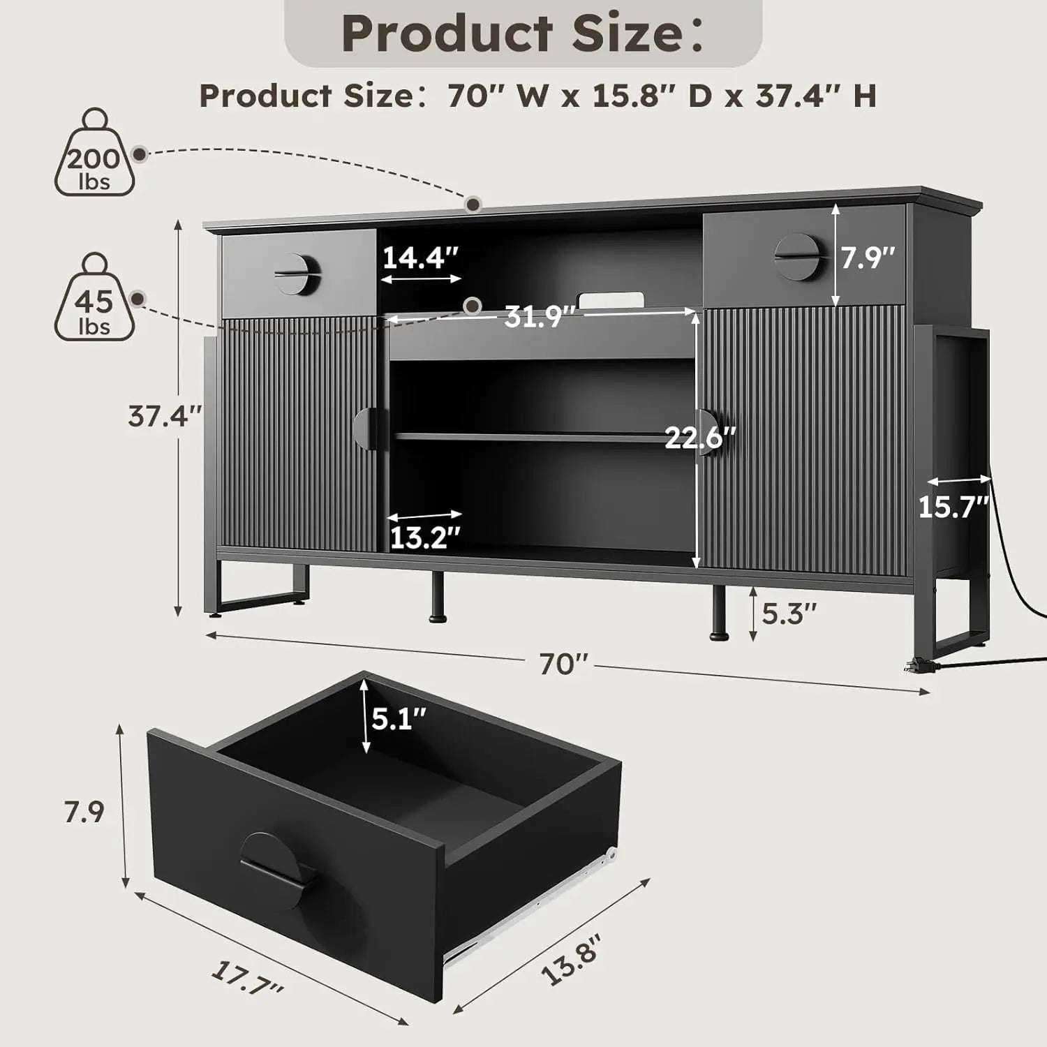 Fluted TV Stand 70 Inch for Living Room with Charging Outlets for TVs Up to 80 Inch