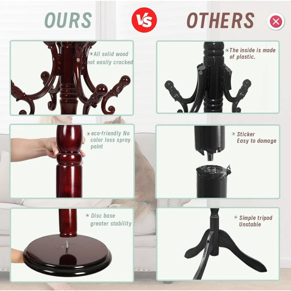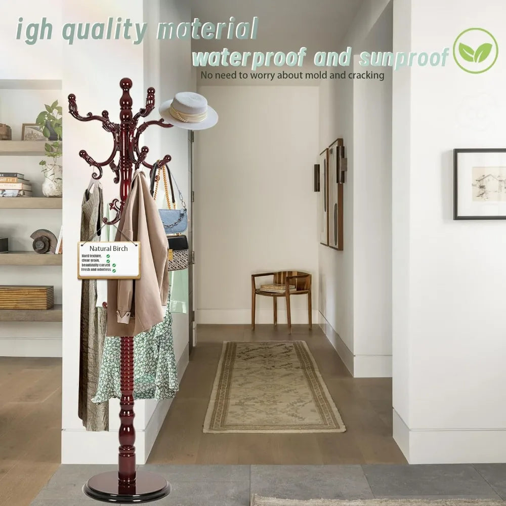Freestanding Coat Rack Solid Wood 14 Hooks Adjustable Height Stand