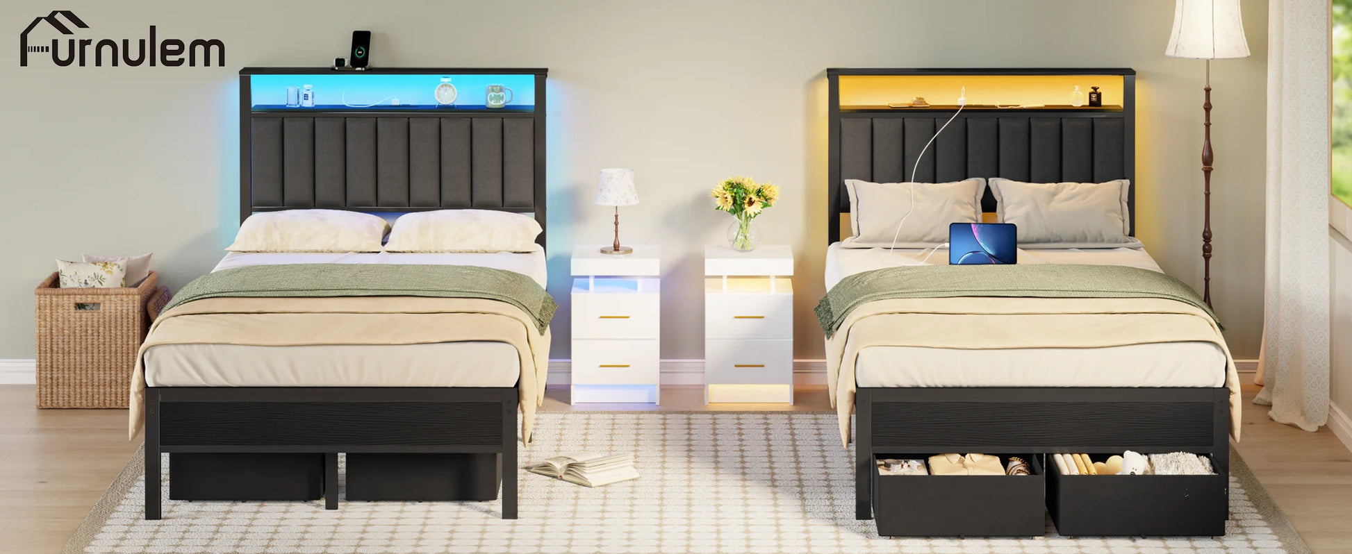 Ljustra Full Bed Frame with Charging Station LED Lights and Storage