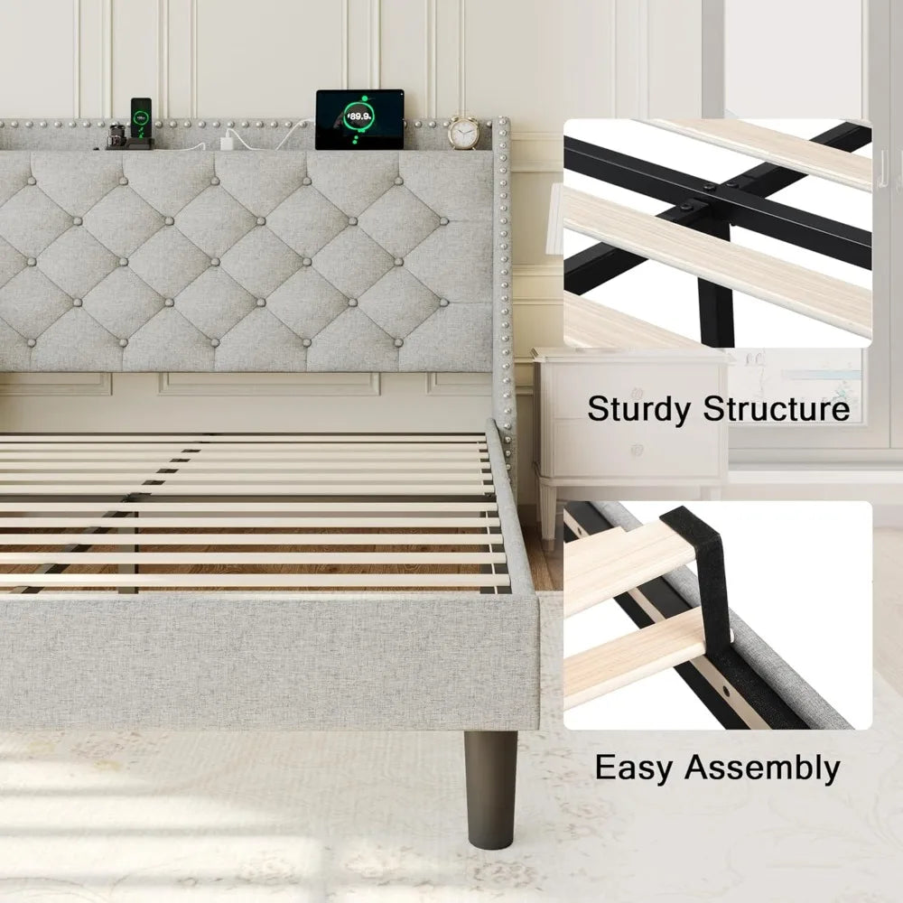 Full Size Bed Frame Wingback Tufted Storage Headboard with AC Ports