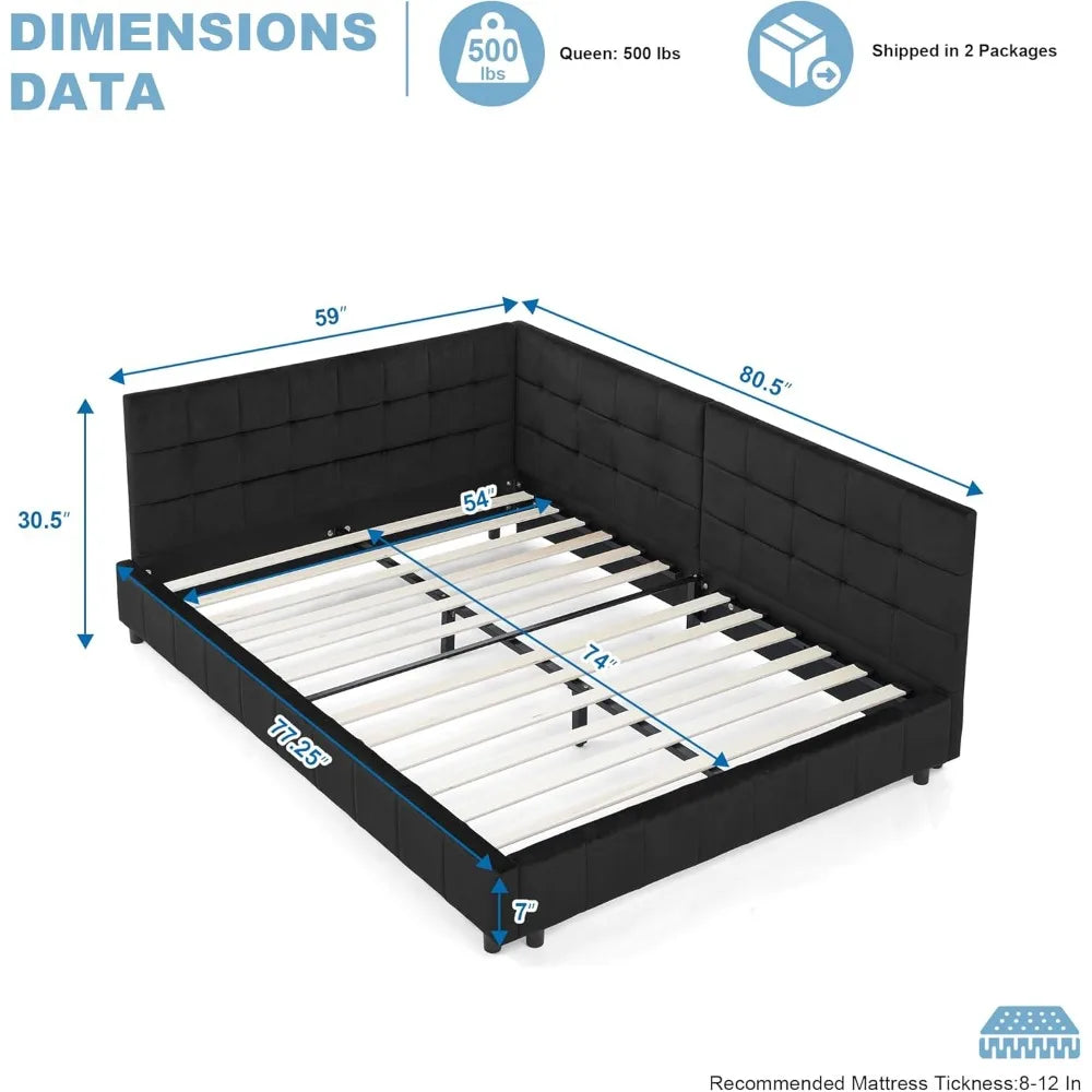 Full Size Corner Bed Frame Velvet Tufted L Shaped Daybed Modern Sofa