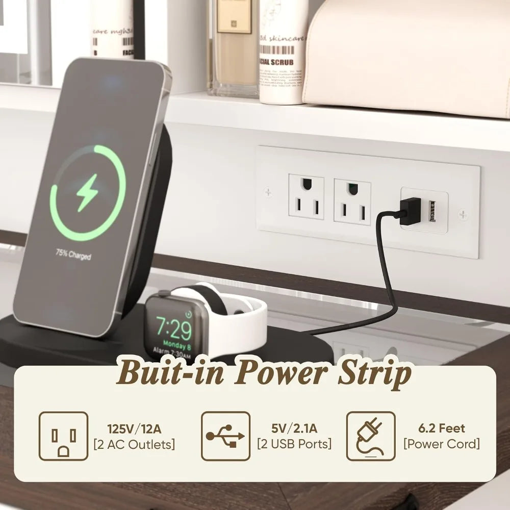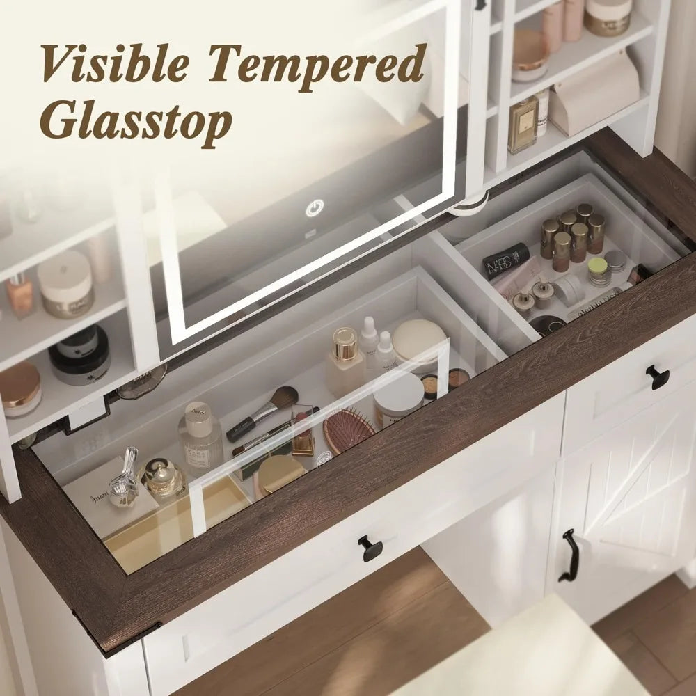 Glasstop Makeup Vanity Desk with Power Outlet Sliding Mirror 42" Farmhouse