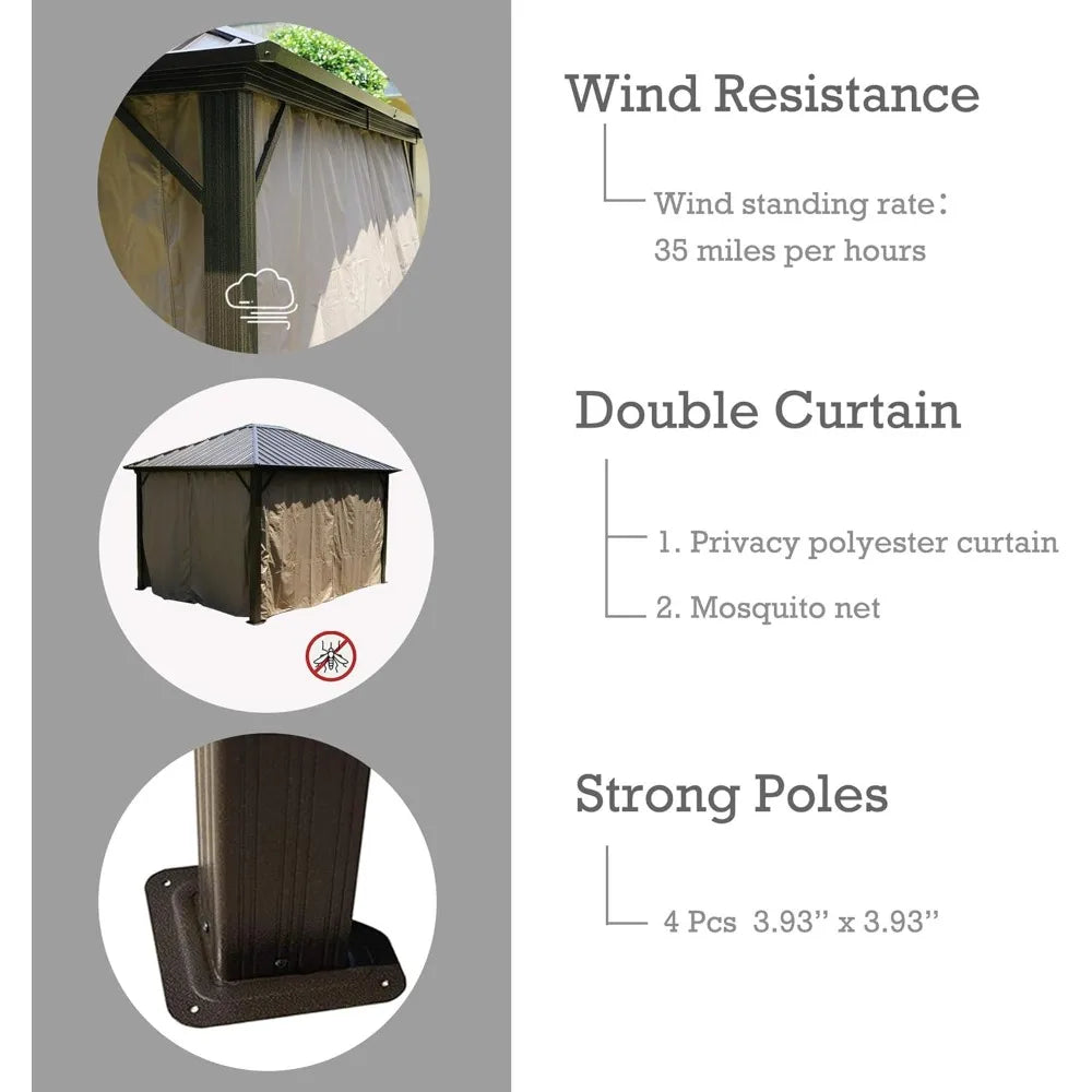 - Robust Construction: Crafted with a dark brown rustproof aluminum frame, this gazebo is built to last with 4 sturdy triangular aluminum stand poles.