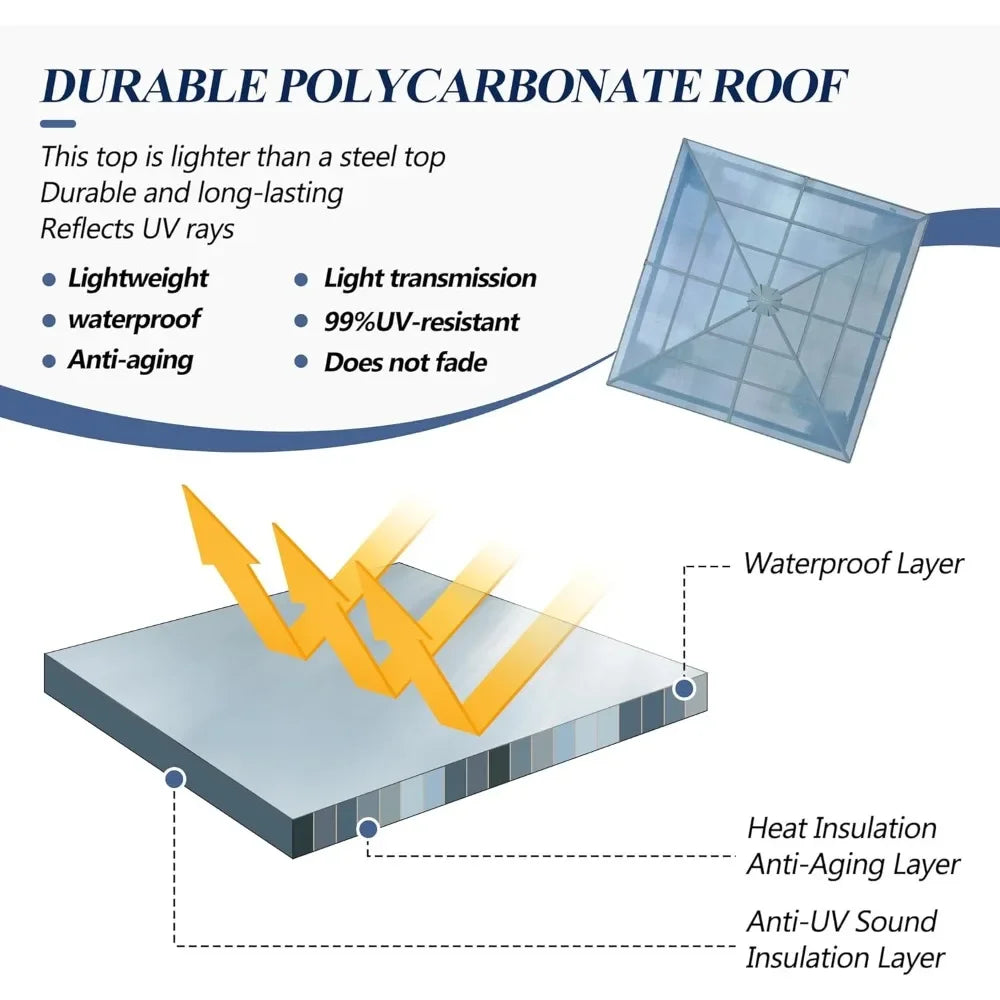 - Translucent Polycarbonate Roof: Filters out 99% of harmful UV rays while providing a stunning view of the sky, perfect for star-gazing.