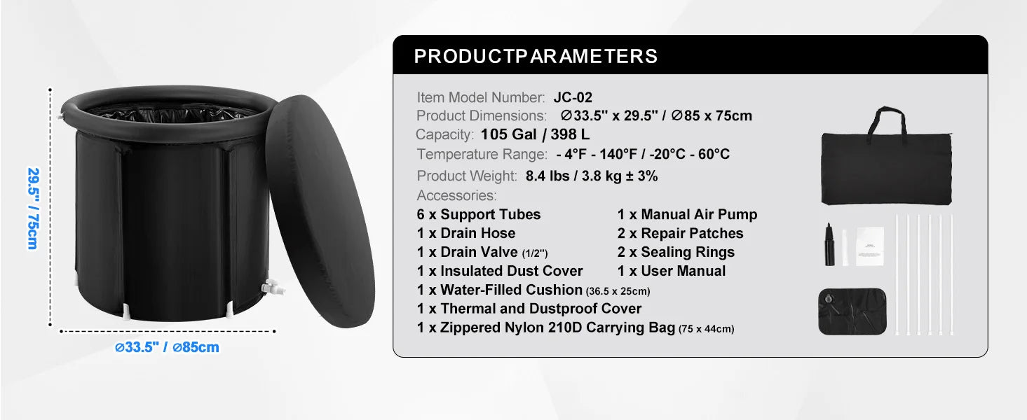 - Easy Setup: Quickly assemble the tub with no tools required, and enjoy an effortless cold plunge experience.