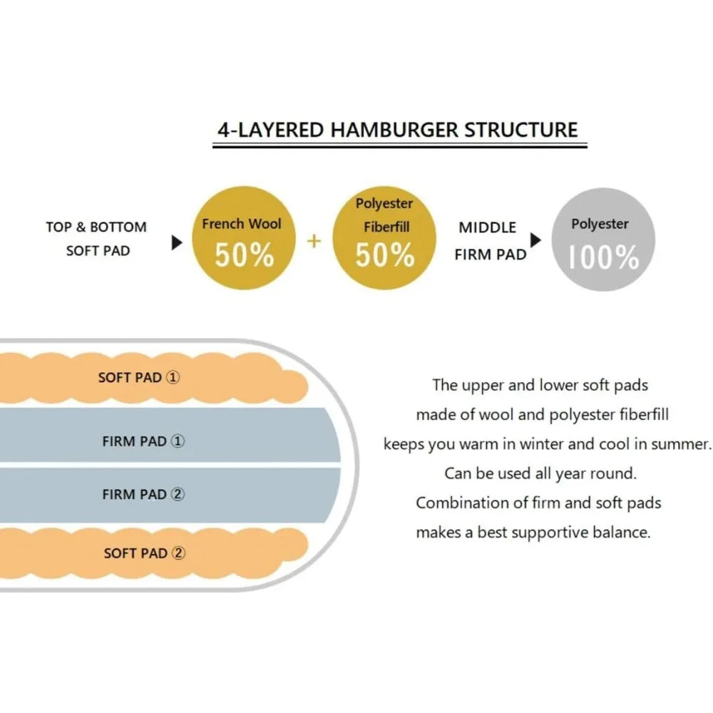 - Construction: 4-layered hamburger structure for enhanced comfort