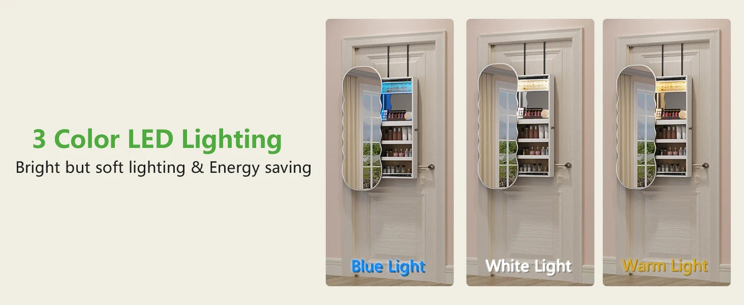 - Lighted Interior Mirror: Enjoy a beautifully lit mirror with three color options—blue, white, and warm yellow—ideal for your makeup routine.