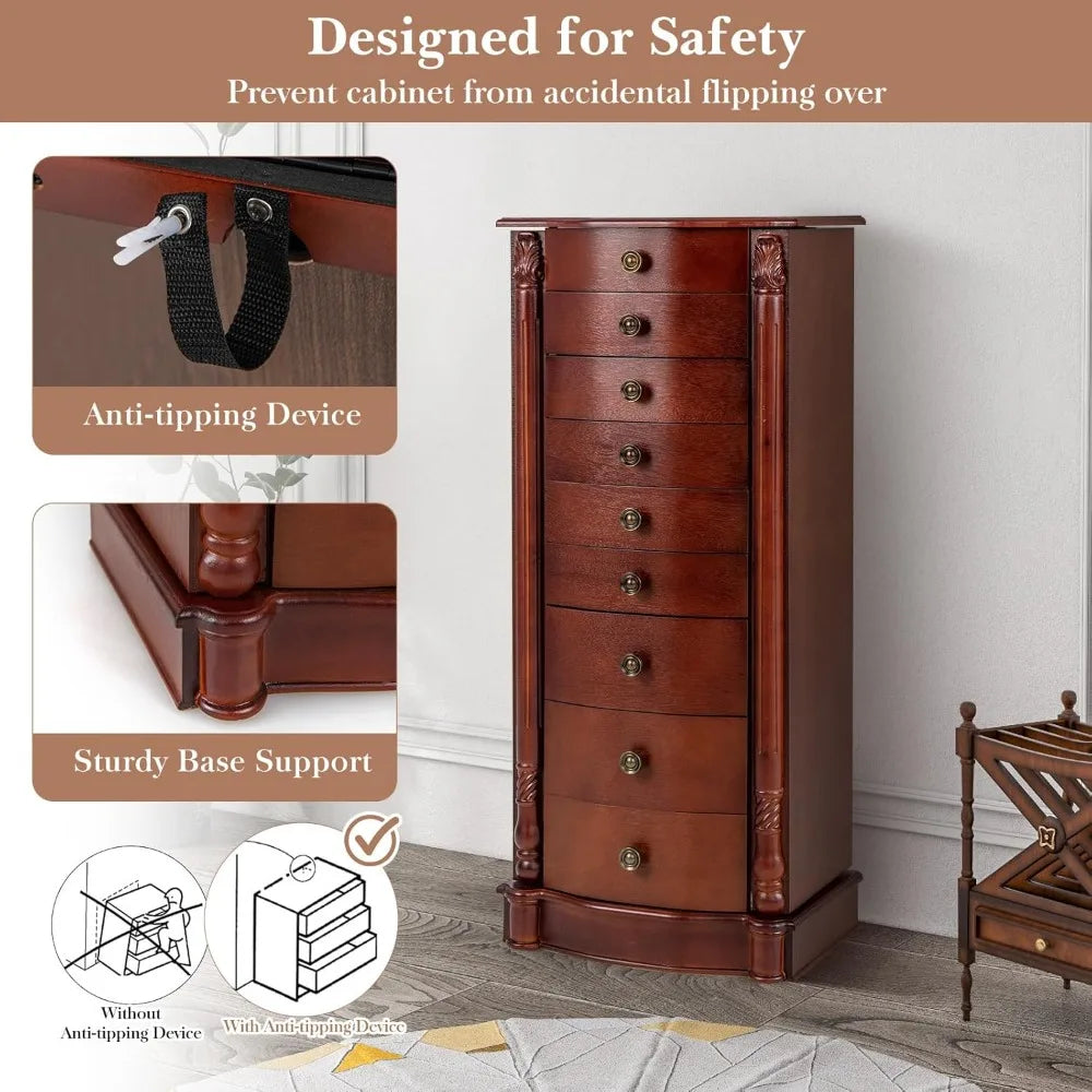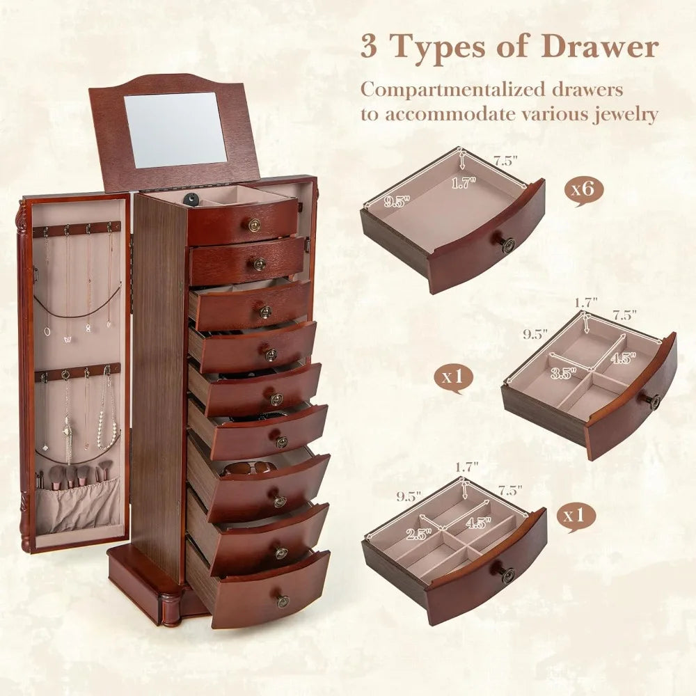 - Classified & Spacious Storage: This jewelry cabinet features 9 layered compartments, including 8 drawers, designed to keep your necklaces, bracelets, rings, and watches organized and tangle-free.