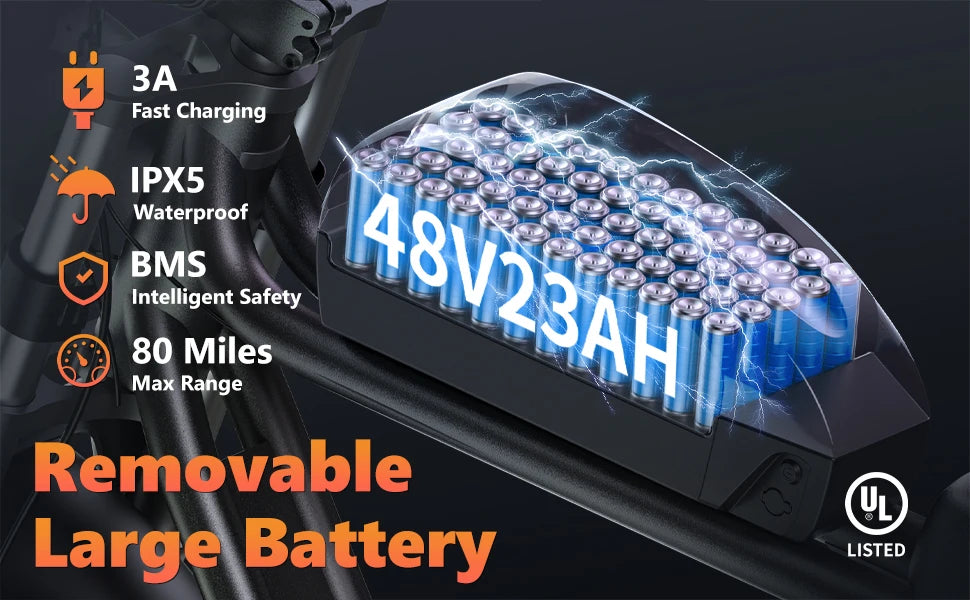 - Long-Lasting Battery: The 48V 23Ah Samsung lithium battery offers a pure electric range of 45-55 miles and pedal assist range of 75-85 miles.