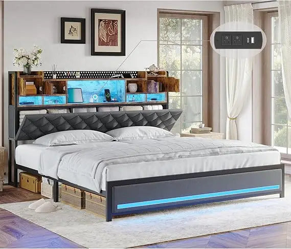 King Size Bed Frame with Storage Headboard LED Lighting Charging Station