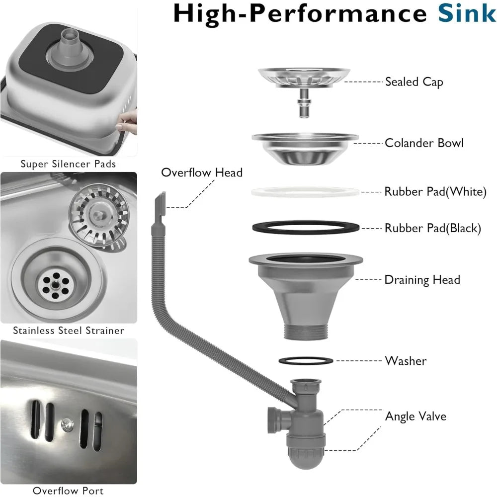 - Premium 304 Stainless Steel Sink: The spacious 14.9" x 14.9" x 10.2" basin is perfect for washing produce, meats, or hands, featuring removable filters to prevent clogs.