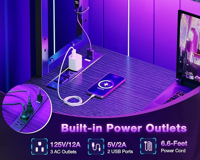 - Built-In USB Charging Ports: Equipped with 3 AC outlets and 2 USB ports for easy access to all your devices while you work or play.