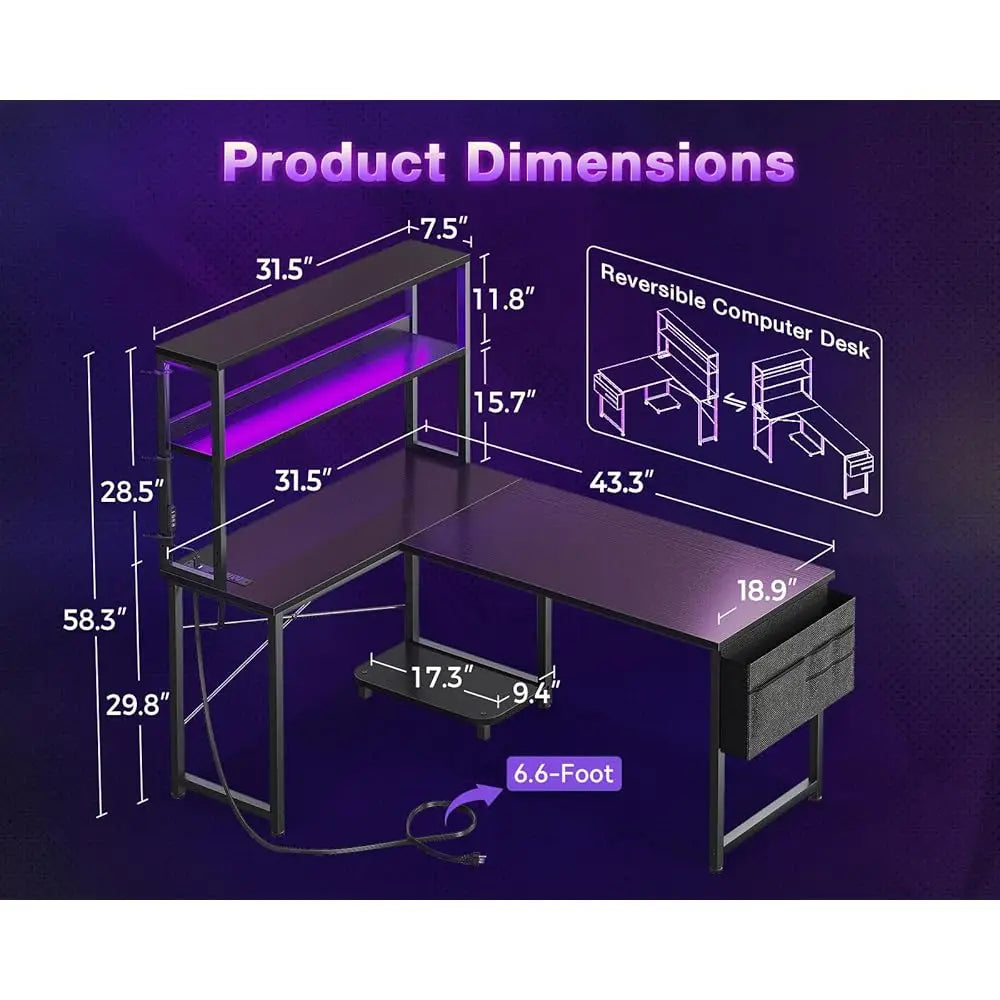 L Shaped Desk with LED Lighting Gaming Desk with Power Outlets Storage