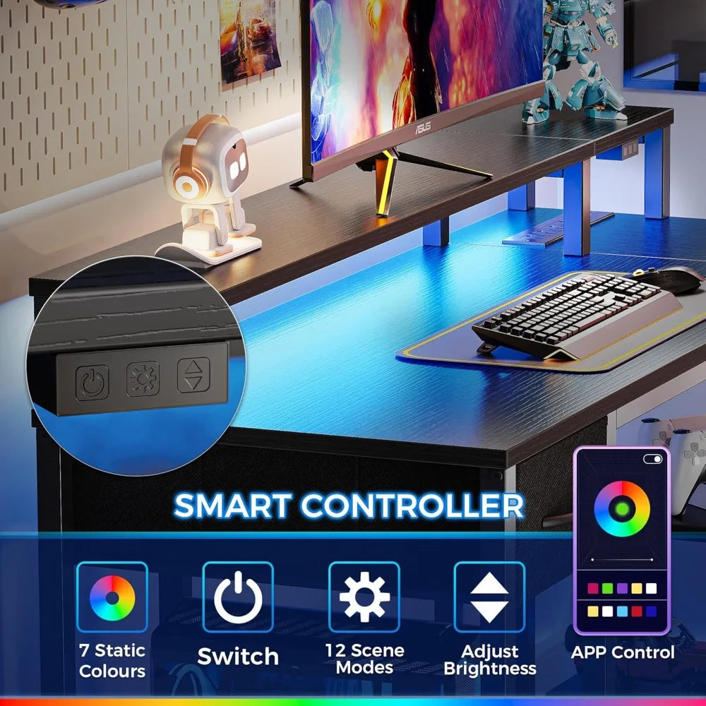 L Shaped Desk with LED Lights Power Outlets Monitor Stand Gaming Desk