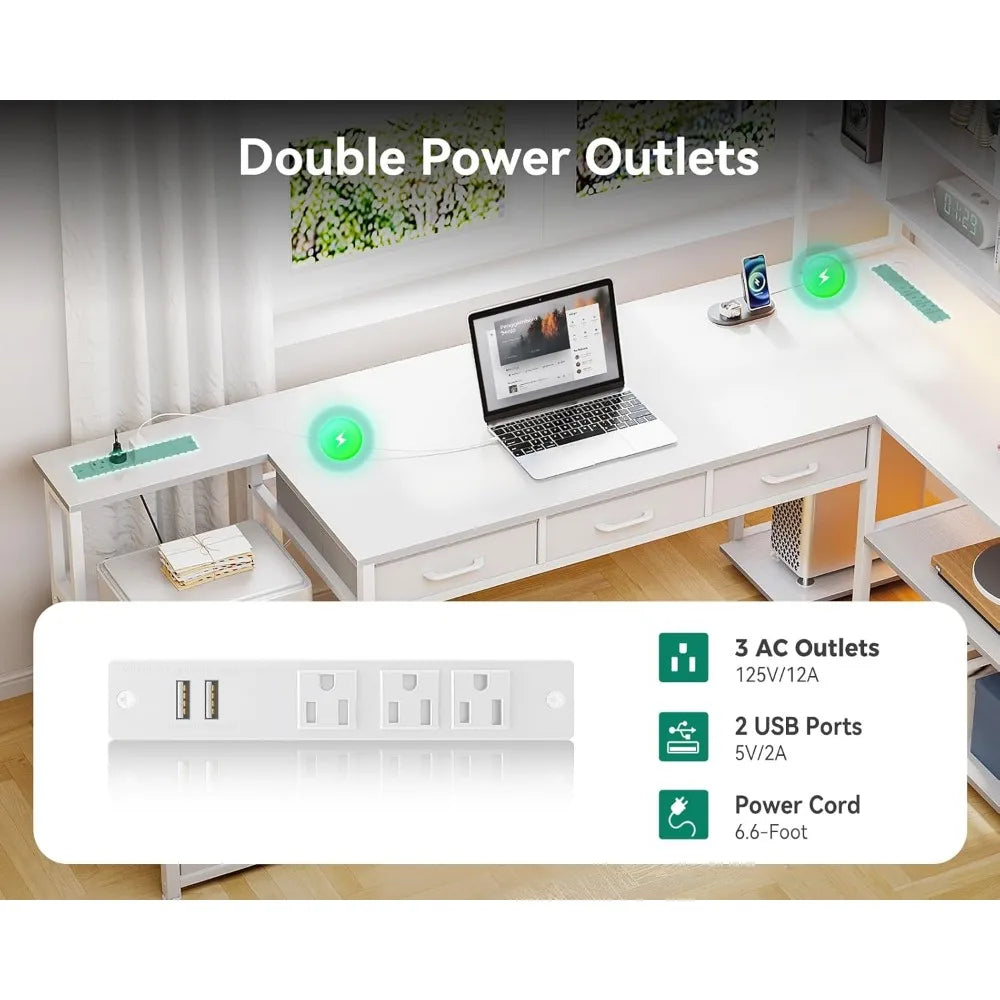L Shaped Desk with File Drawers Gaming Desk with Power Outlets LED Lights