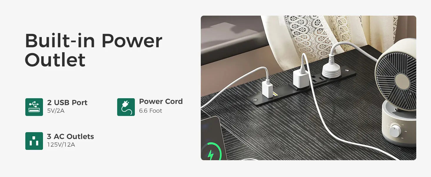 - USB Charging Outlets: Stay connected with built-in power outlets and USB ports, perfect for charging devices while you work or play.