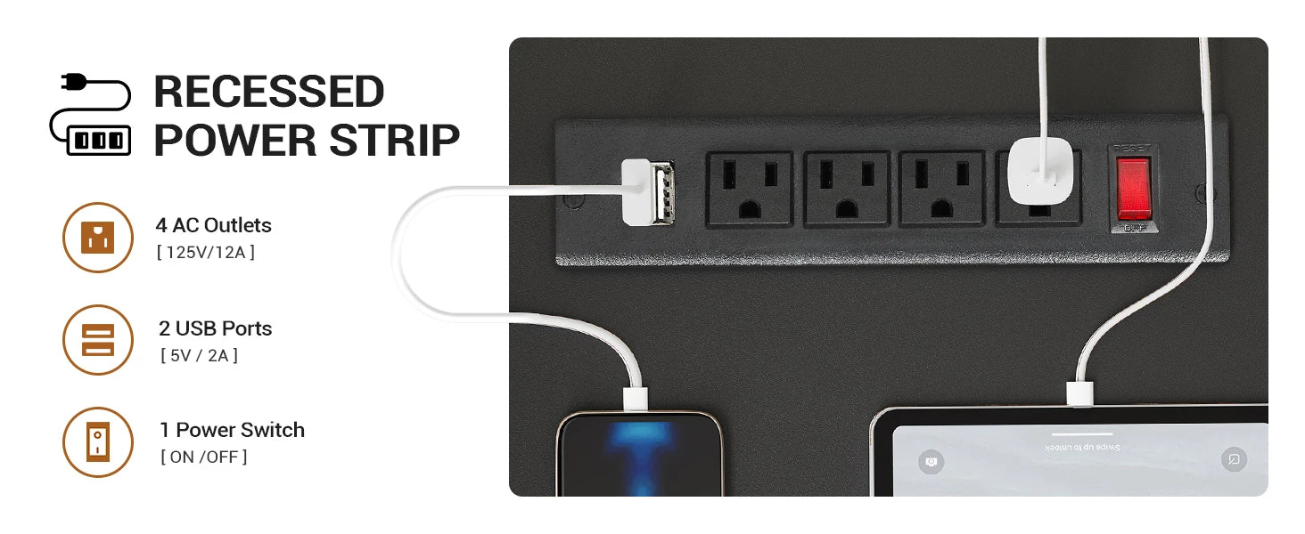 - Integrated Power Outlet: Stay charged and connected with built-in power outlets, perfect for all your devices.
