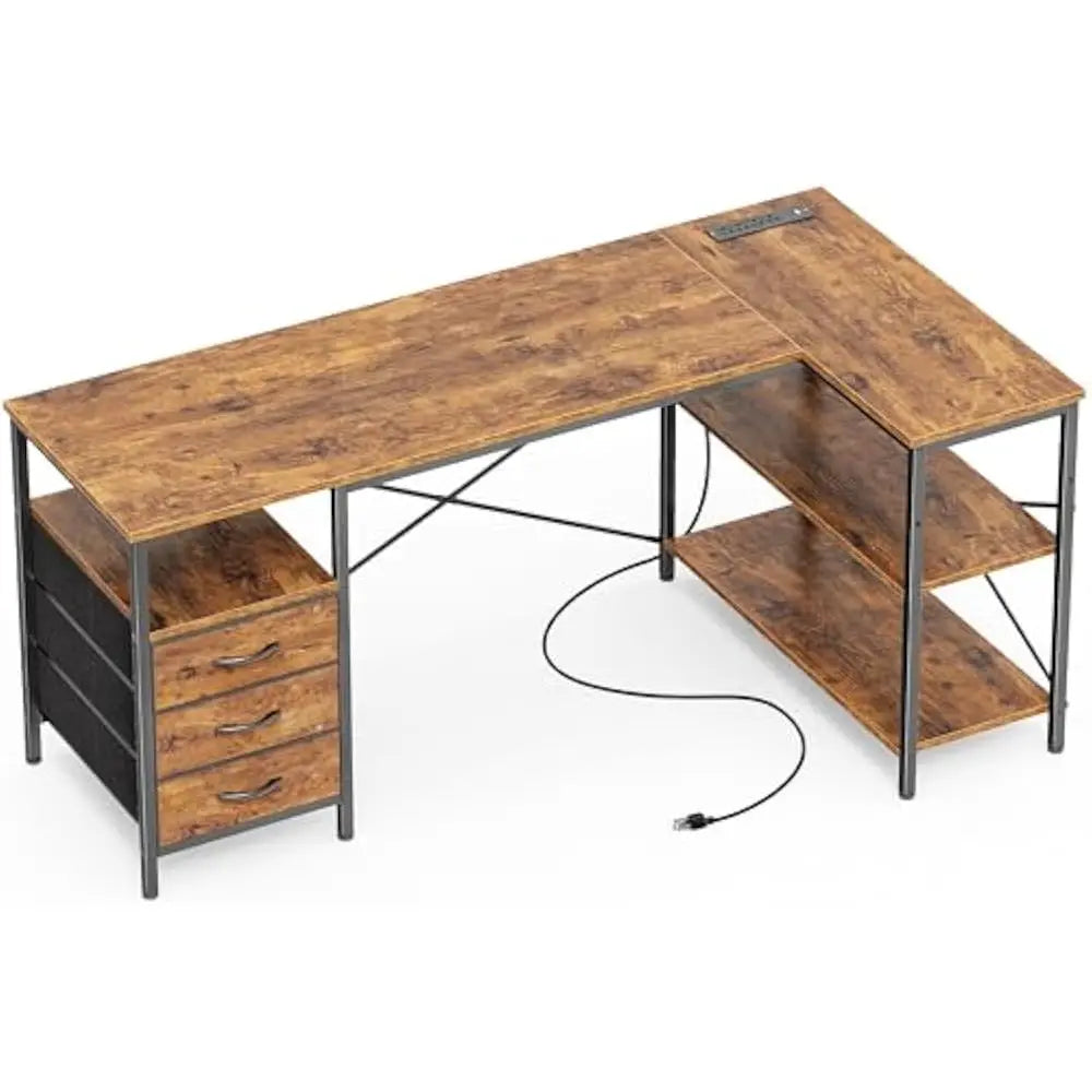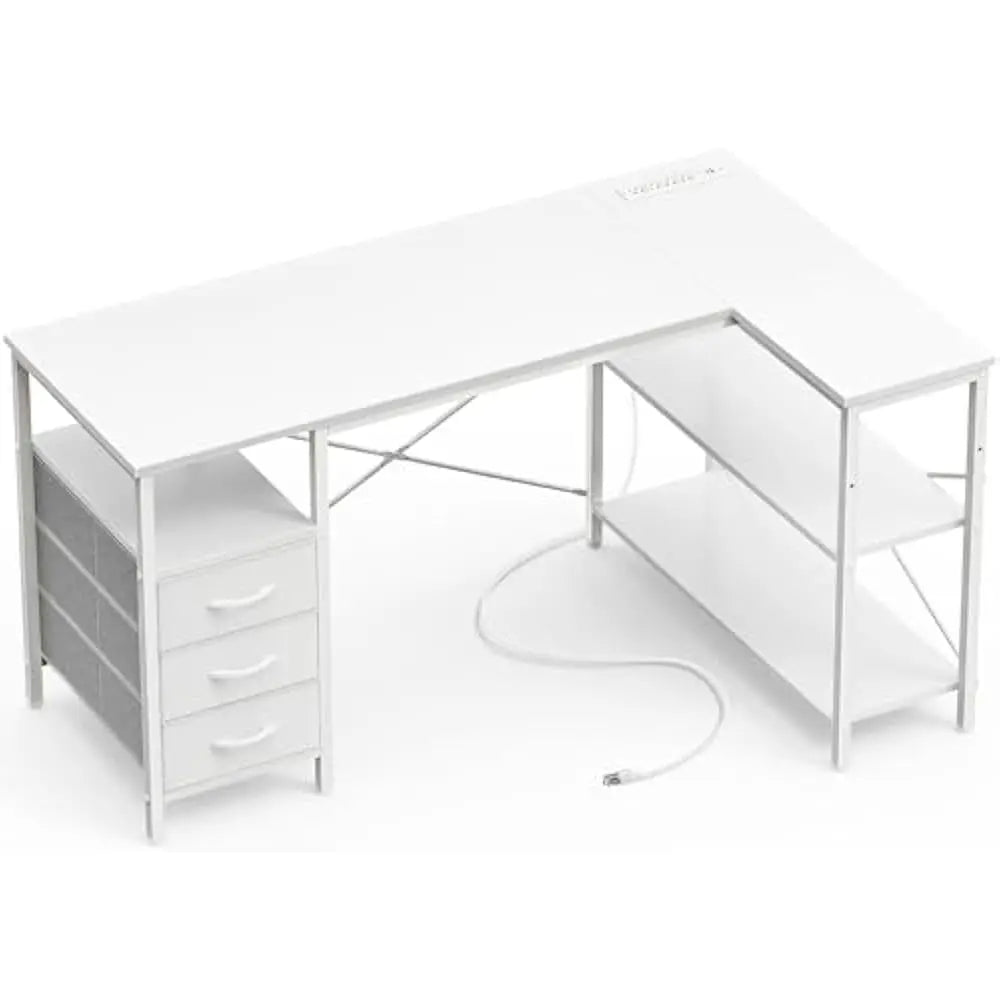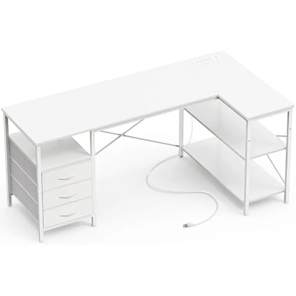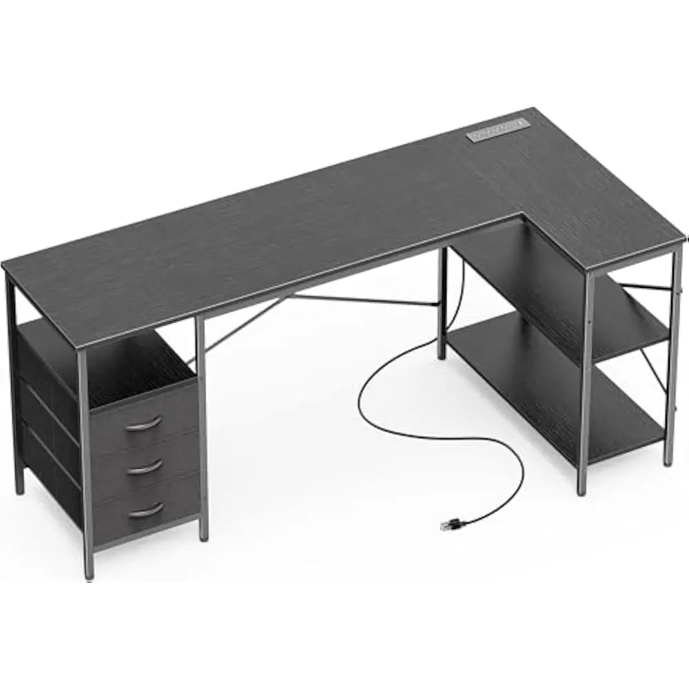 L Shaped Office Desk with Power Outlets and 3 Drawers for Home Office