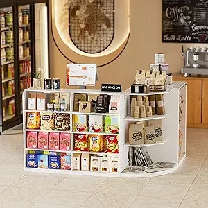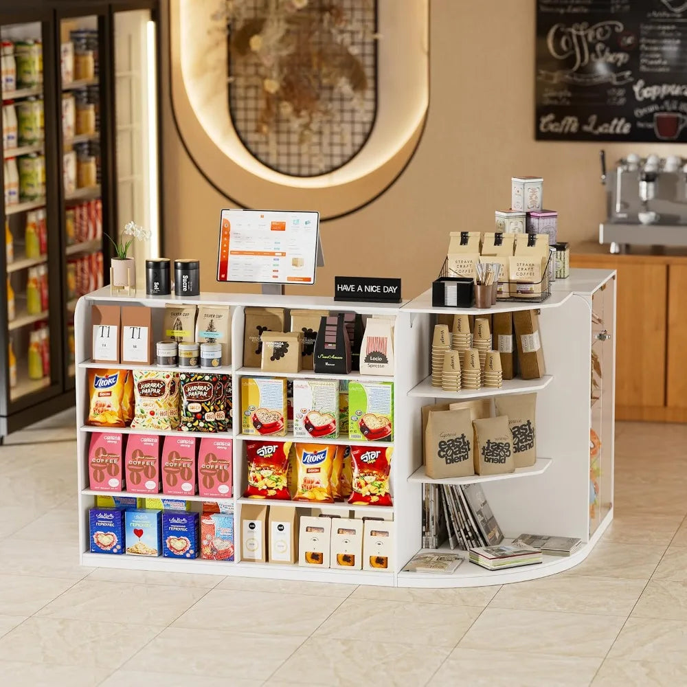- Multifunctional Workstation: Equipped with 12 shelves, 2 drawers, and a keyboard drawer, this desk is perfect for checkout and business equipment.