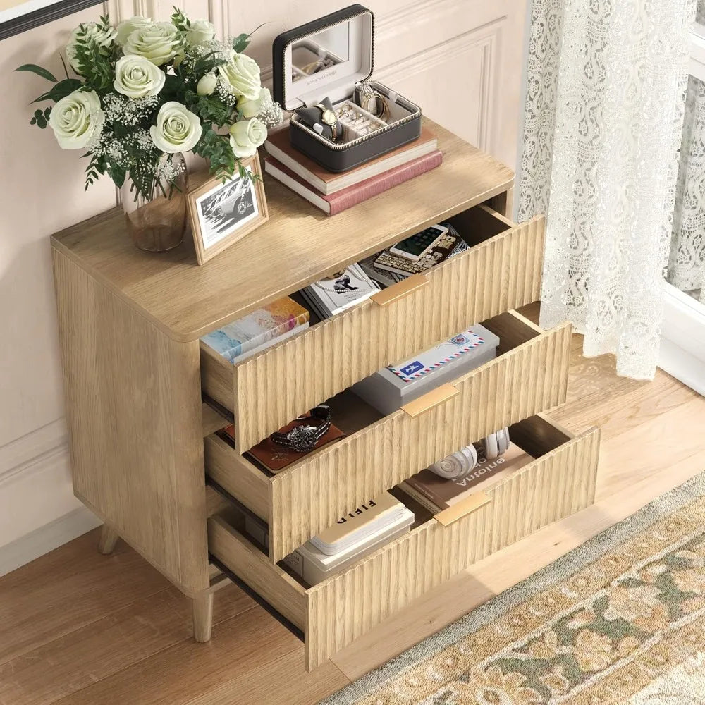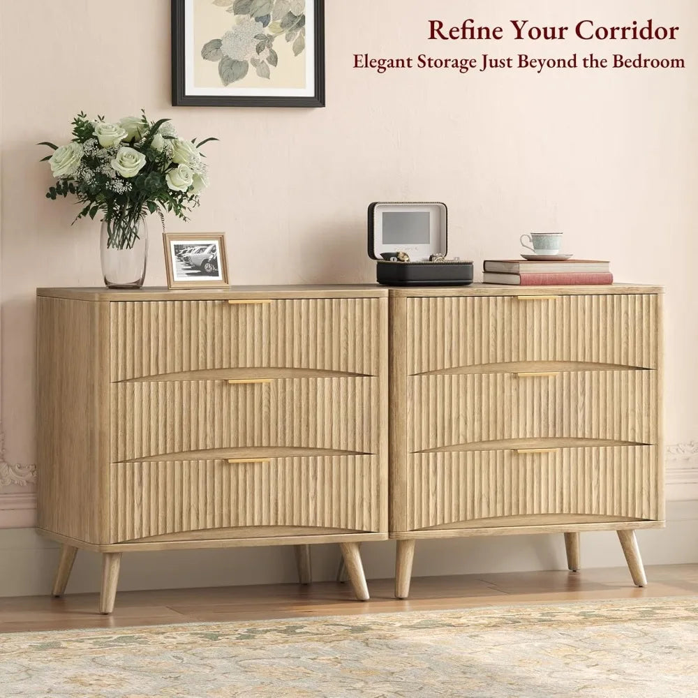Large Fluted Nightstands Set of 2 3-Drawer Wood Bedside Table