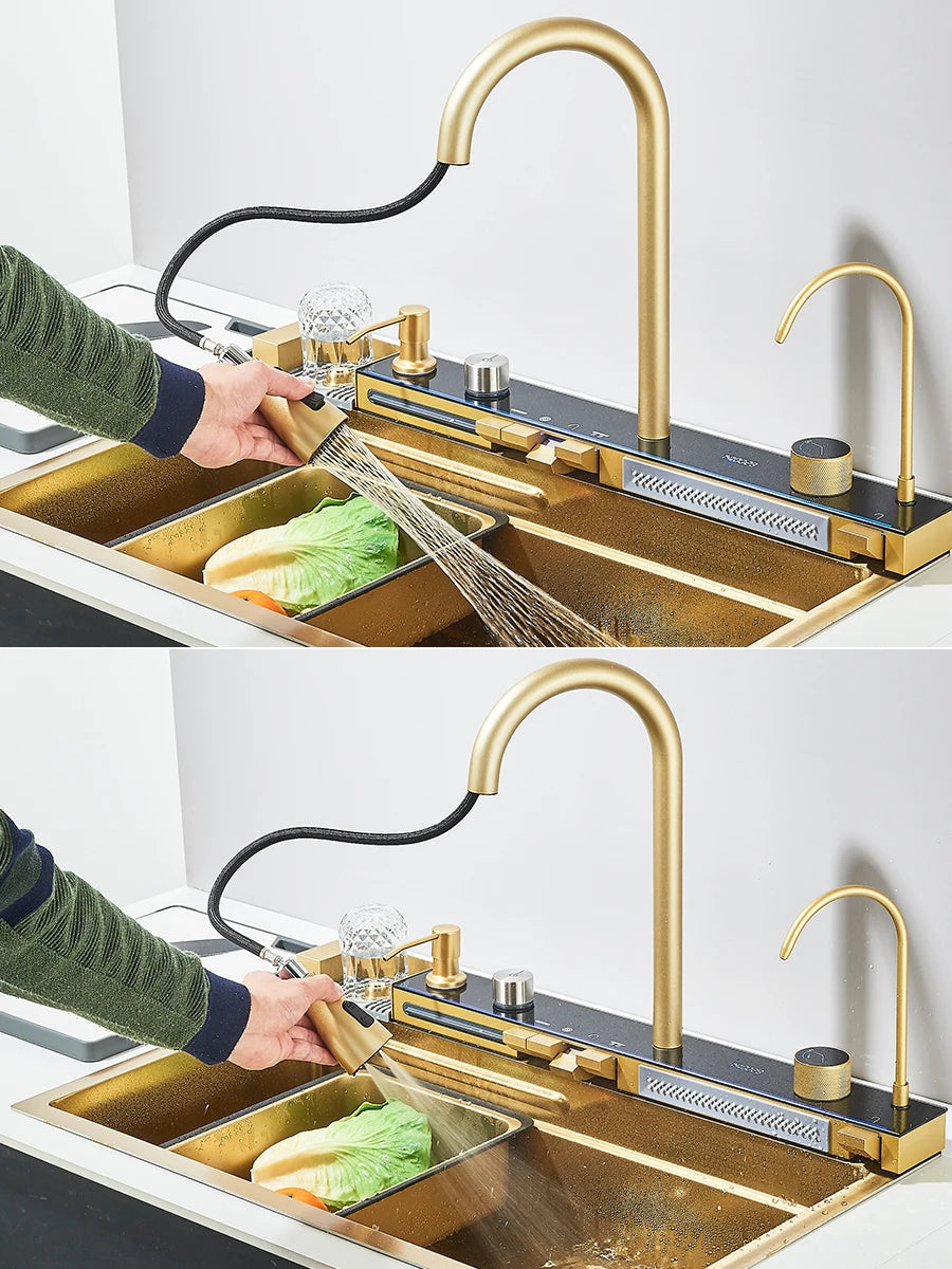 Elevate your kitchen experience with the Ljustra Large Stainless Steel Kitchen Sink. Designed with functionality and elegance in mind, this stunning waterfall sink is perfect for modern homes.