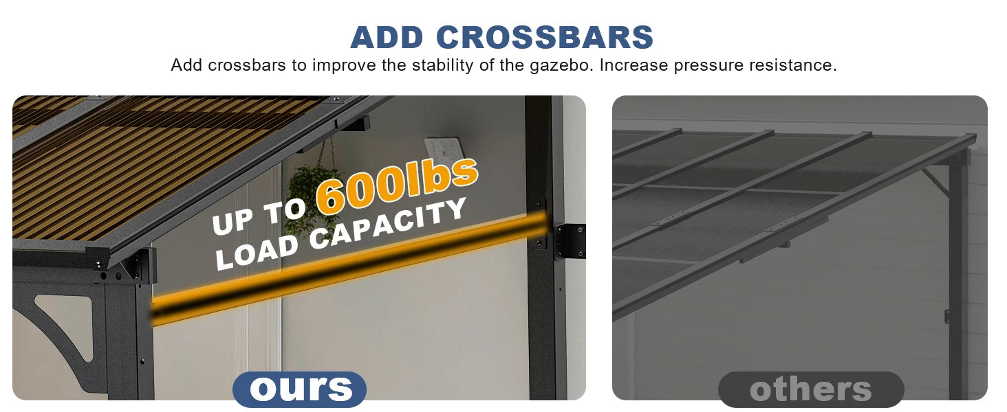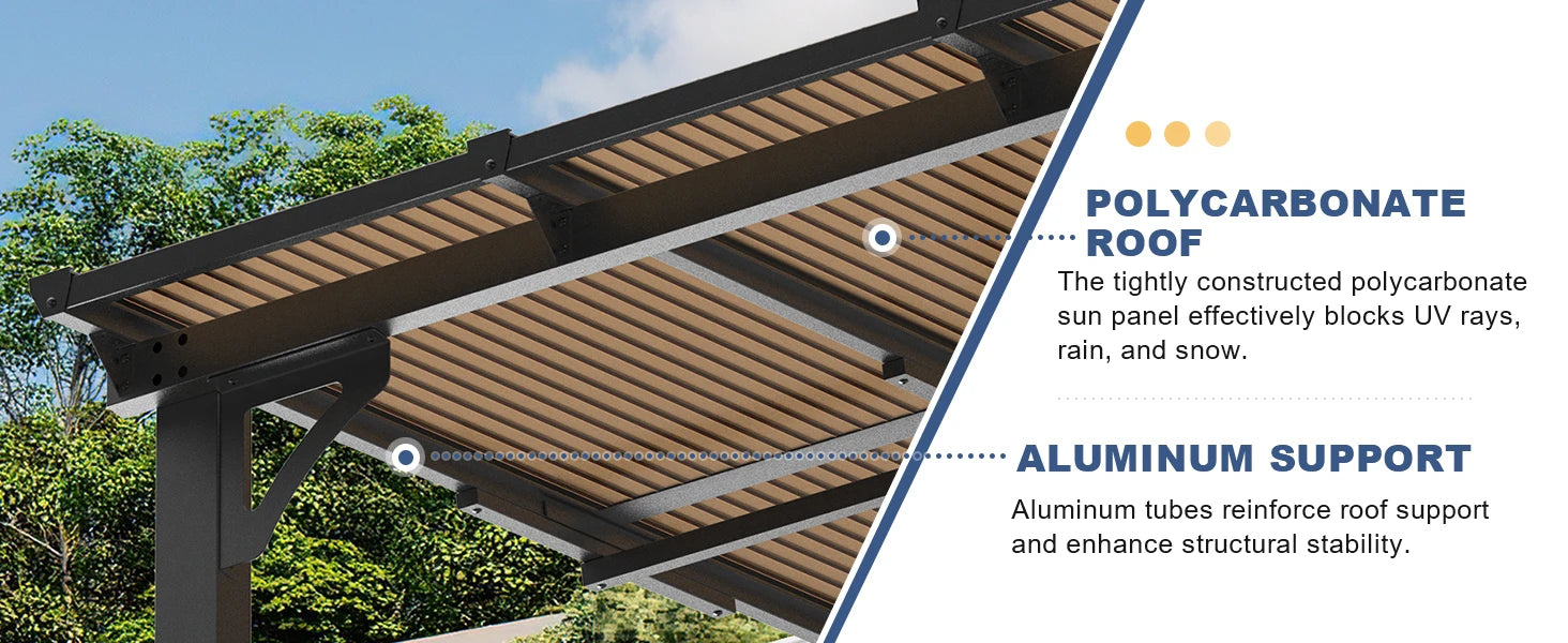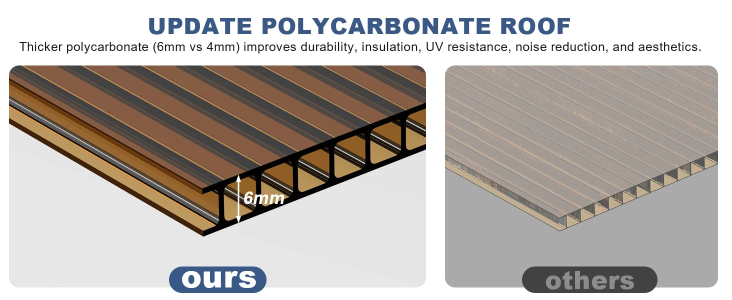 - Polycarbonate Roof: Offers excellent UV protection, reflecting up to 95% of harmful rays while supporting up to 60 lbs/㎡ against heavy snow and rain.