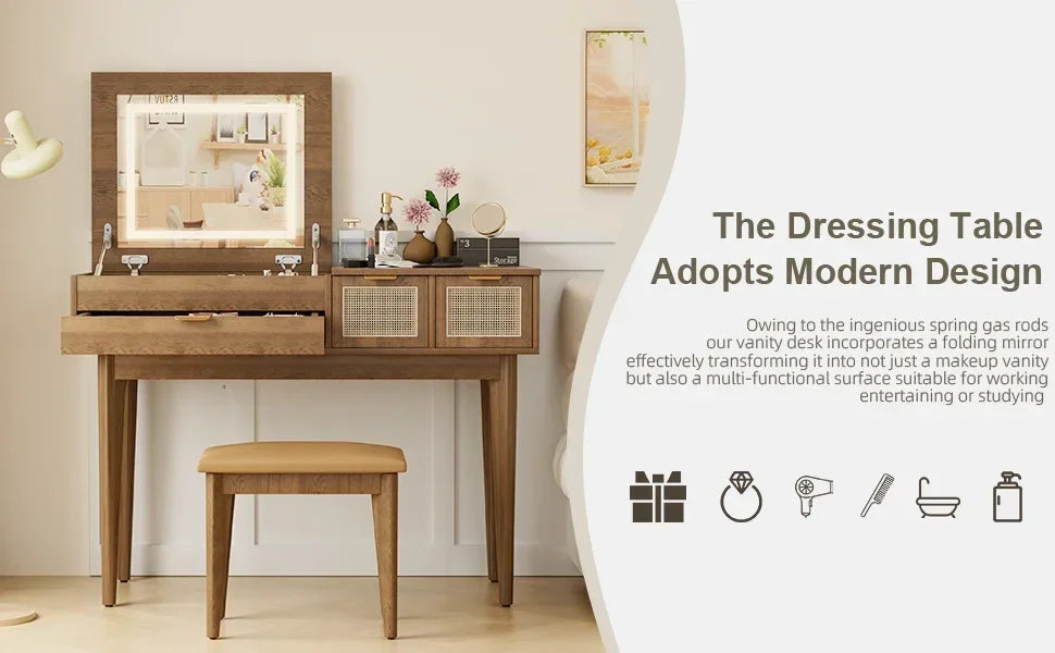 Ljustra LED Lighted Vanity Desk with Openable Mirror and Storage Stool