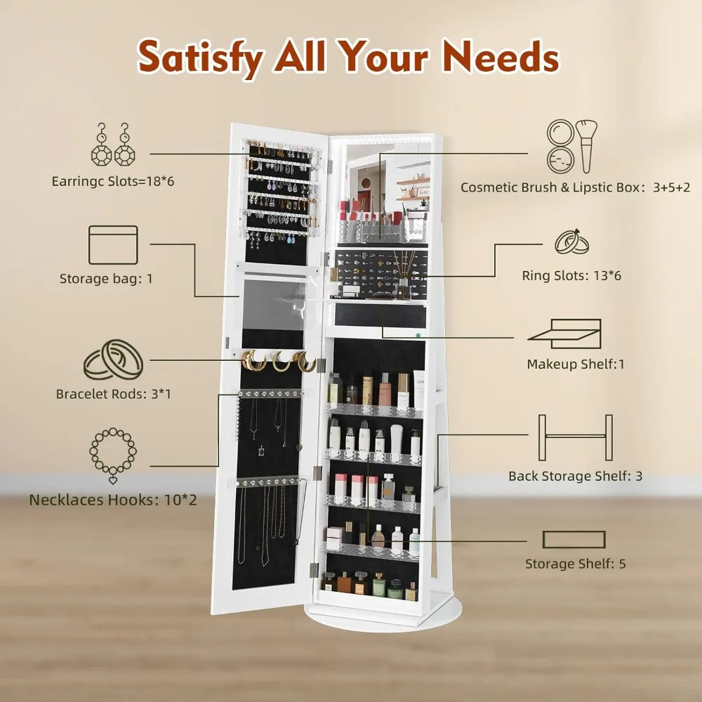 LED Mirror Jewelry Cabinet Full-Length Swivel Armoire with Lights