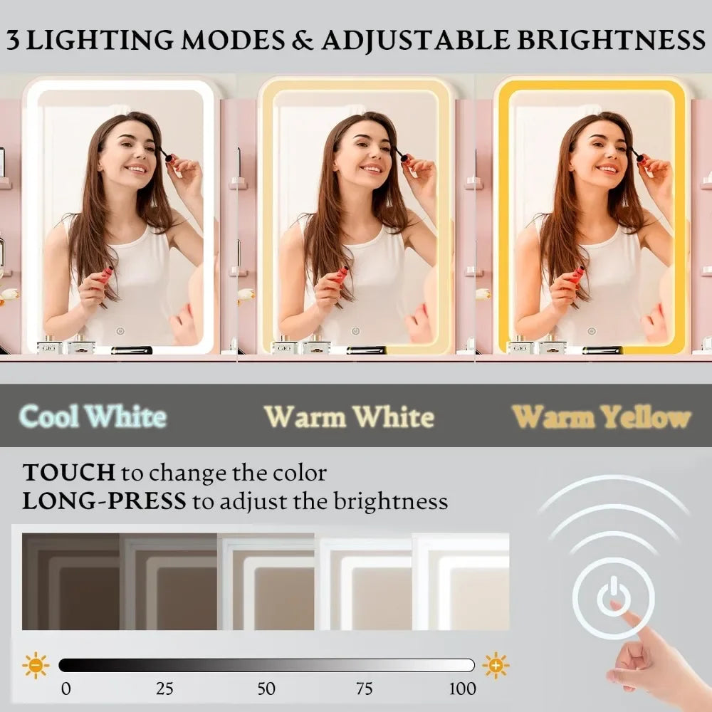 - LED Mirror with 3 Light Modes: Enjoy a mirror equipped with an adjustable LED light strip offering warm yellow, natural light, and bright white settings to suit all your makeup needs.