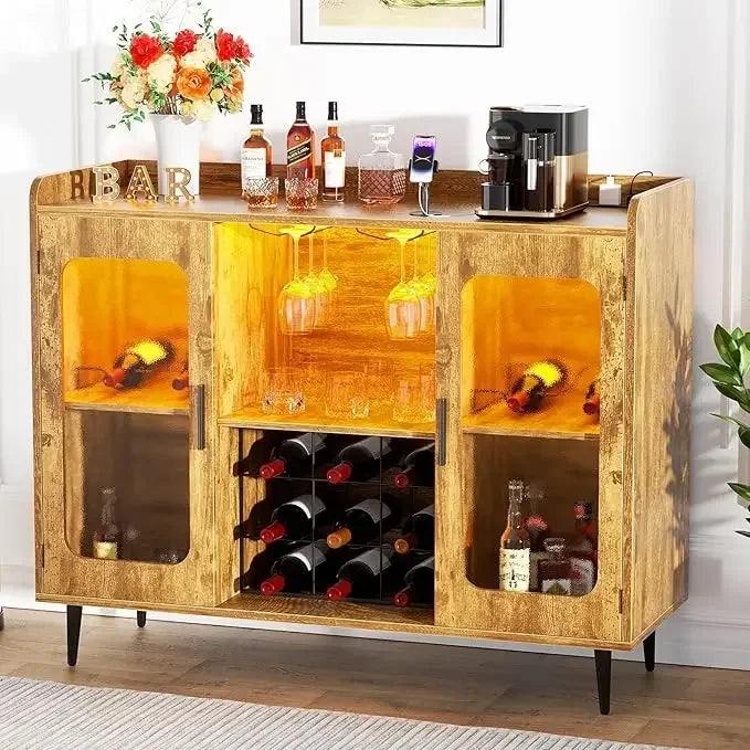 Liquor Cabinet Bar with Power Outlet LED Light Wine Storage Kitchen